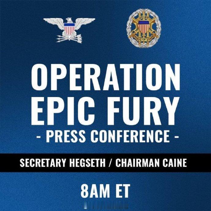 据媒体报道,美国国防部宣布将于美国东部时间周四上午8点(今天晚上8点)召开关于“史诗级愤怒”行动的新闻发布会,美国国防部长皮特·赫格塞斯和美军参谋长联席会议主席丹·凯恩将出席并发言。