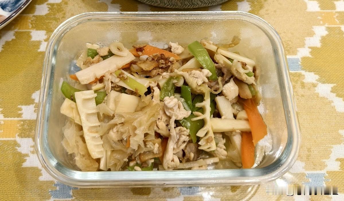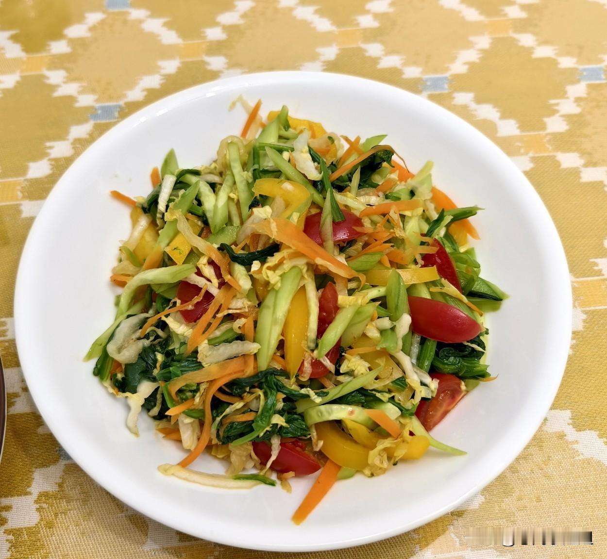 今日早餐两个菜。 拌凉菜,肉片春笋。 肉片春笋是昨晚做的,肉片猪肉和鸡肉,春笋还配了尖椒、胡萝卜和银耳。 凉菜不凉,起锅烧油先炒胡萝卜丝,再放入白菜丝翻炒几下,闭火后放入黄瓜丝、彩椒丝,再放入焯好的菠菜。放盐和蚝油拌匀。很清爽,很入味。