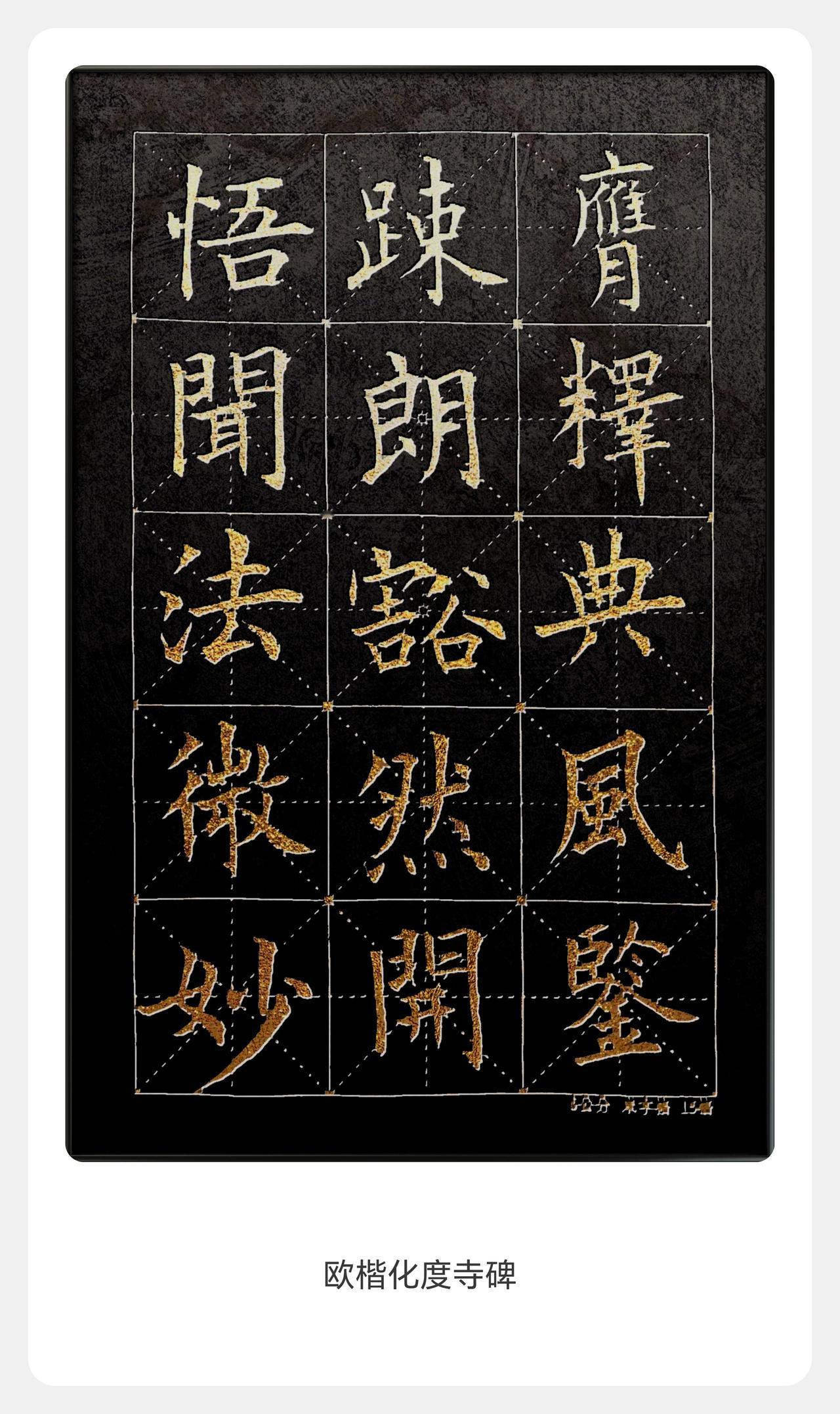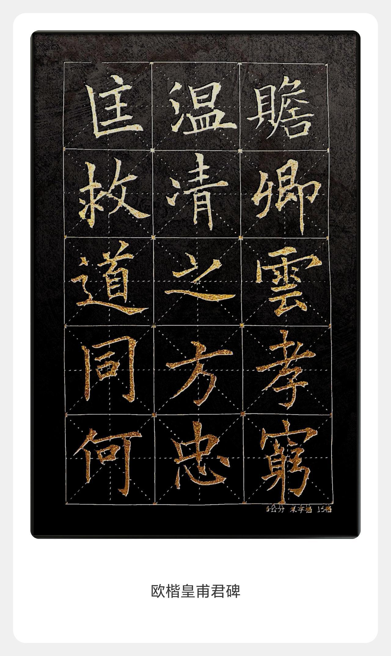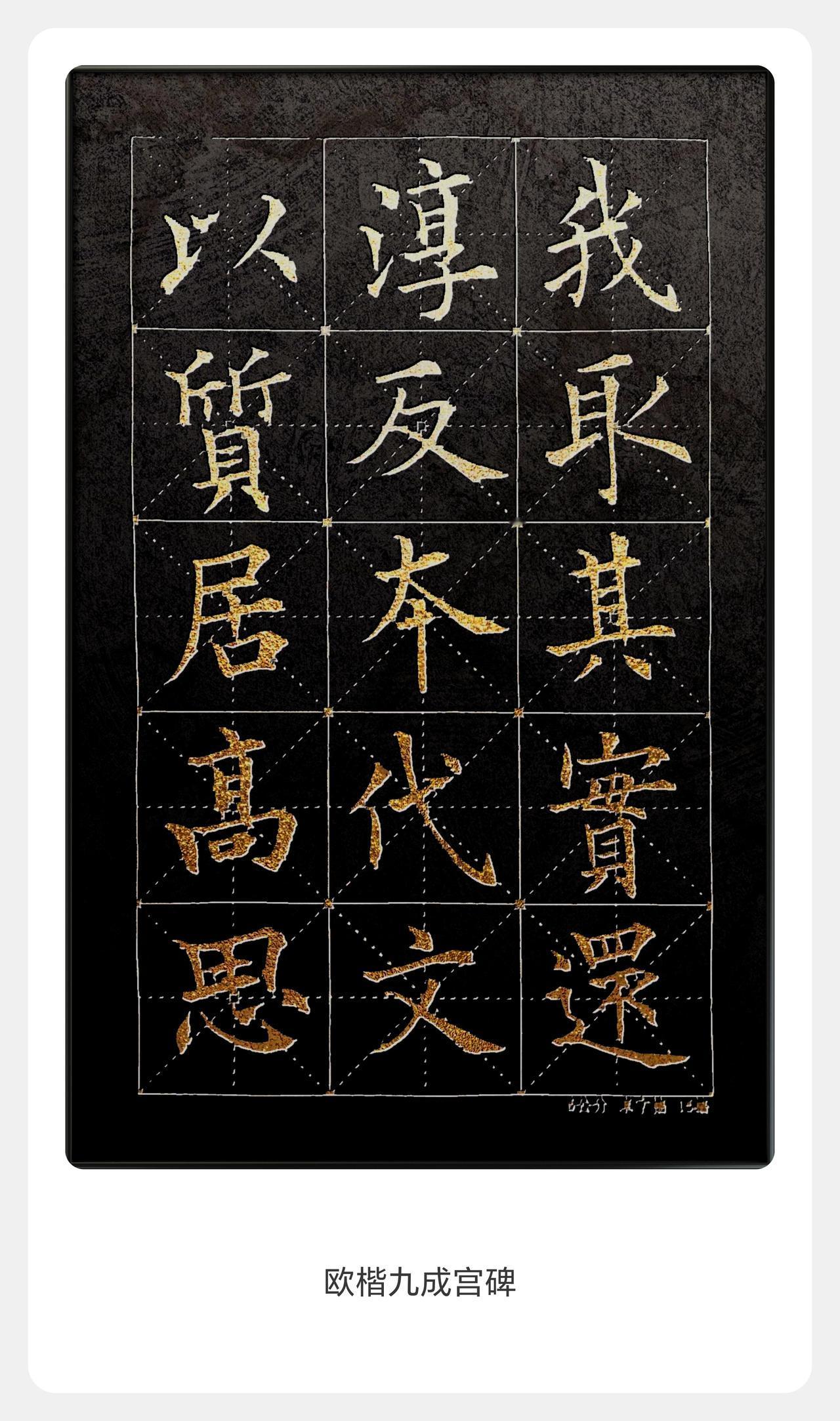 完美复刻原碑“刚柔并济”的特点,横画略带弧度、竖画劲挺,字形方正中见灵动。笔画的刚柔变化自然流畅,将原碑的骨气劲峭与法度严整展现得淋漓尽致,把欧体“险而不倒”的精髓诠释得恰到好处,尽显欧楷“险劲严谨、刚健挺拔”的独特魅力。