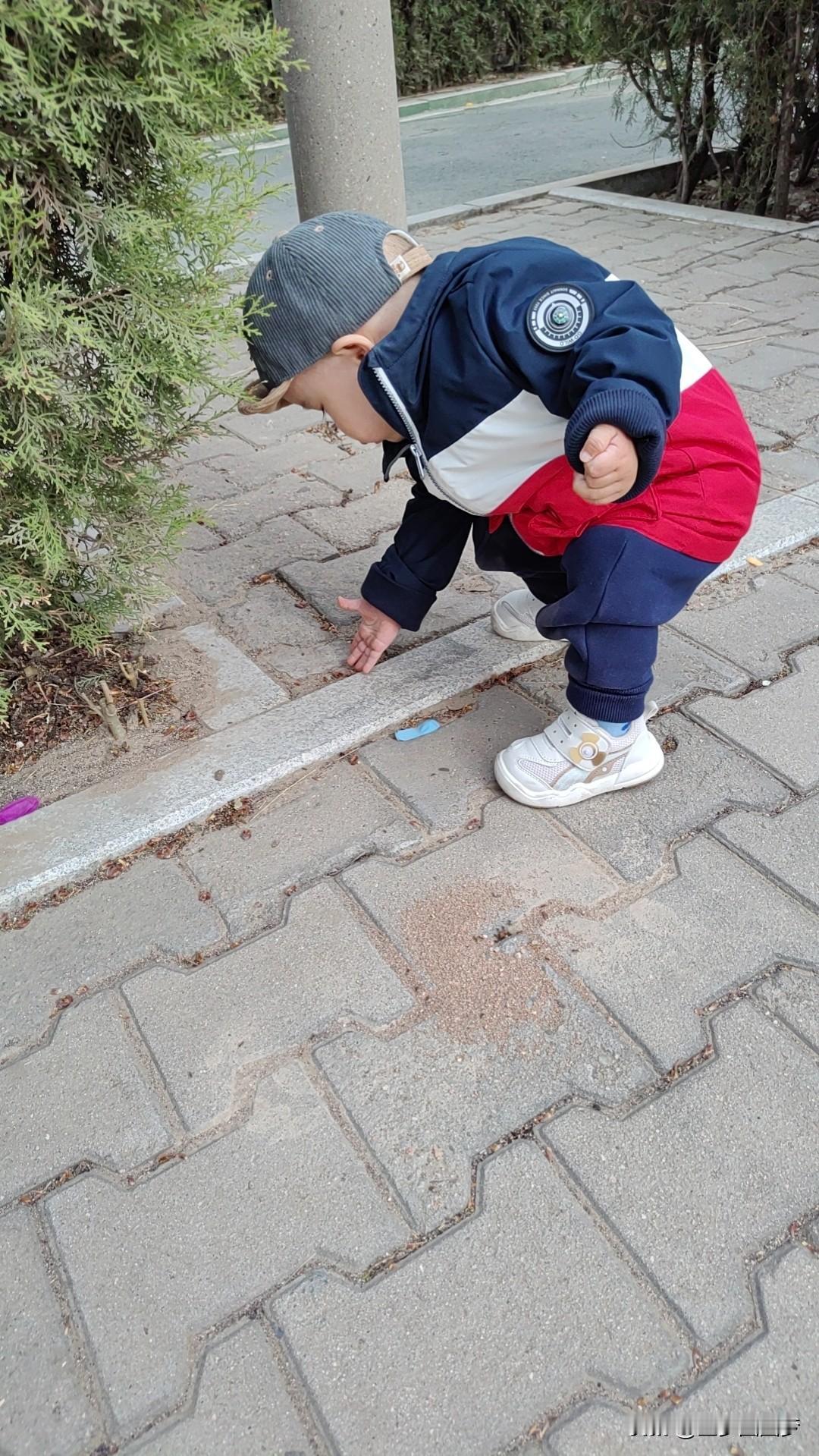 小家伙看到什么也好奇,走着走着会低头看蚂蚁,还想把蚂蚁逮住。