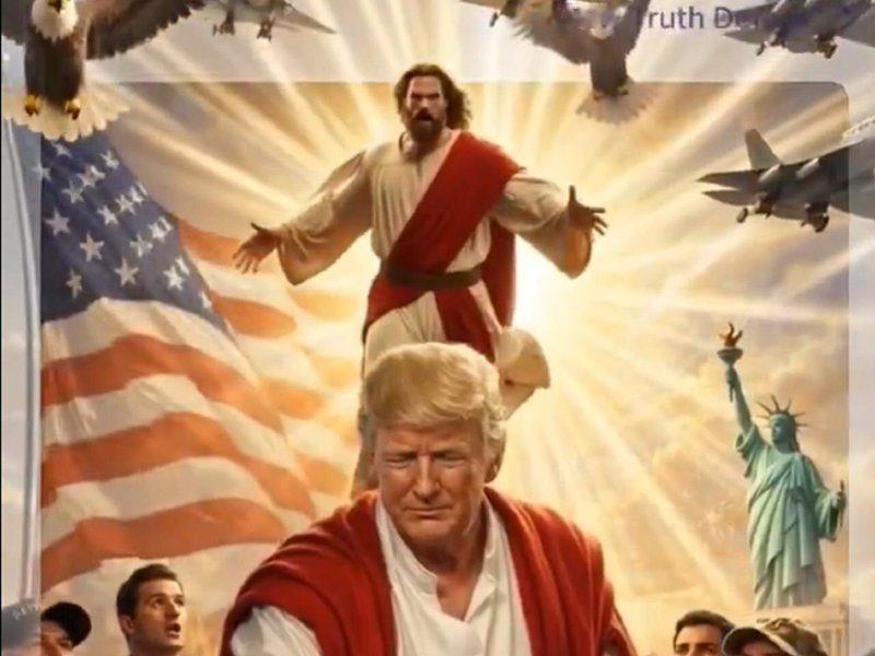 特朗普15日在真实社交上又发图了,是AI生成的“耶稣拥抱自己”的图片,与耶稣紧闭双眼、额头相触并被环抱;身前放着麦克风,身后是国旗(图一)。