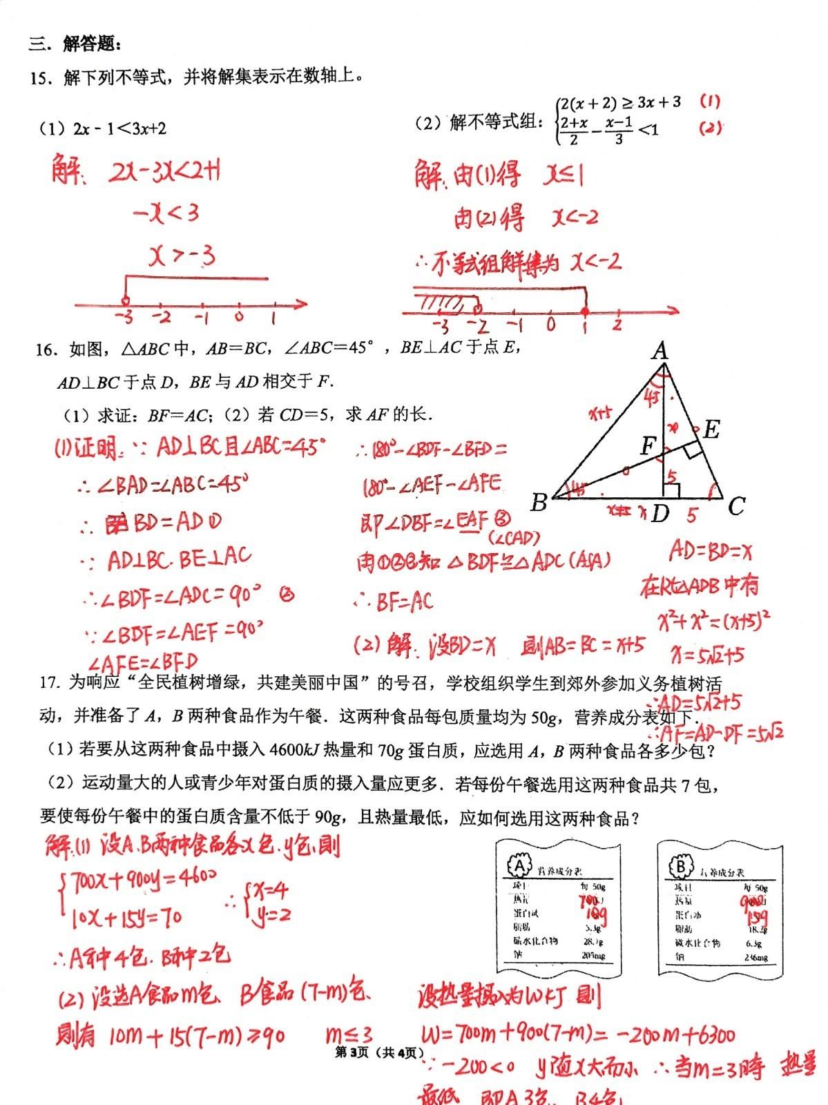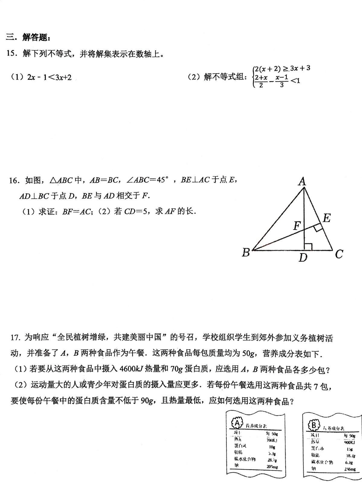 分享一套初二数学期中考试复习卷,主要考点包括三角形证明,不等式不等式组,图形的平