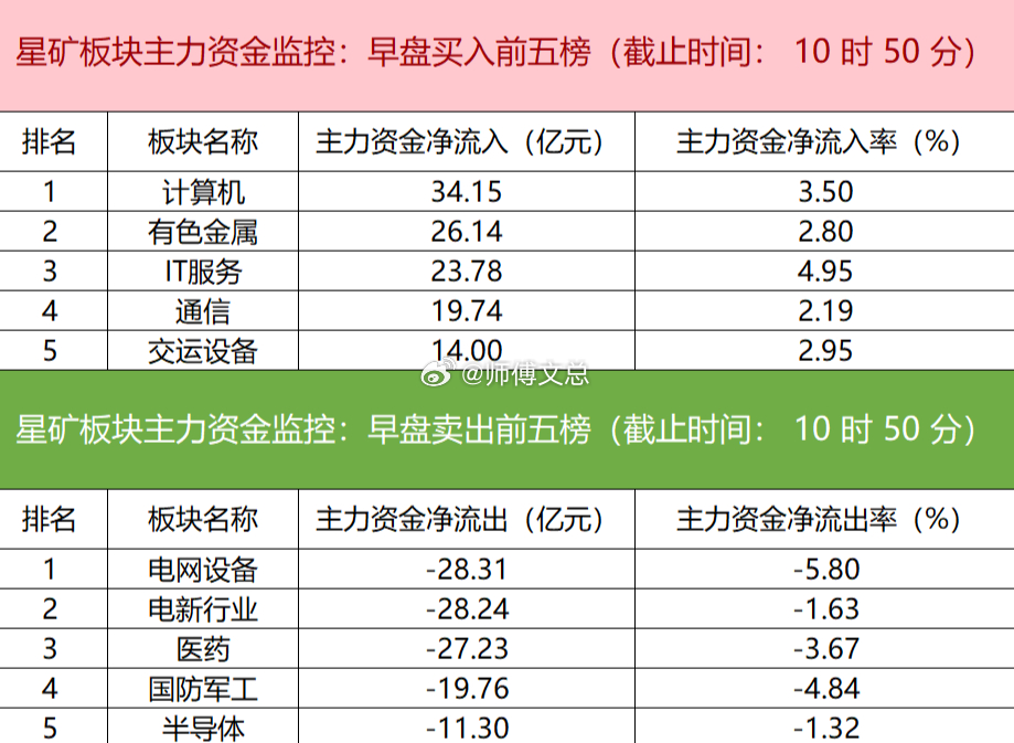 【主力资金监控:计算机板块净流入超34亿】星矿数据显示,今日早盘主力资金净流入计算机、有色金属、IT服务等板块,净流出电网设备、电新行业、医药等板块,其中计算机板块净流入超34亿元。个股方面,N大普微-UW大涨,主力资金净买入超19.64亿元位居首位,新易盛、工业富联、中钨高新获主力资金净流入居前;阳光电源遭净卖出超7亿元,特变电工、中国西电、神剑股份资金净流出额居前。