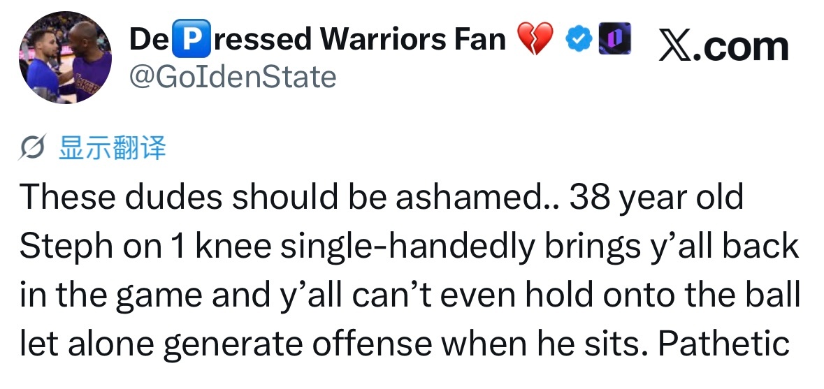 这些家伙真该感到羞耻……38岁的库里拖着一条伤腿,单枪匹马把你们拉回比赛,可当他下场休息时,你们连球都拿不住,更别说创造进攻机会了。太可悲了。