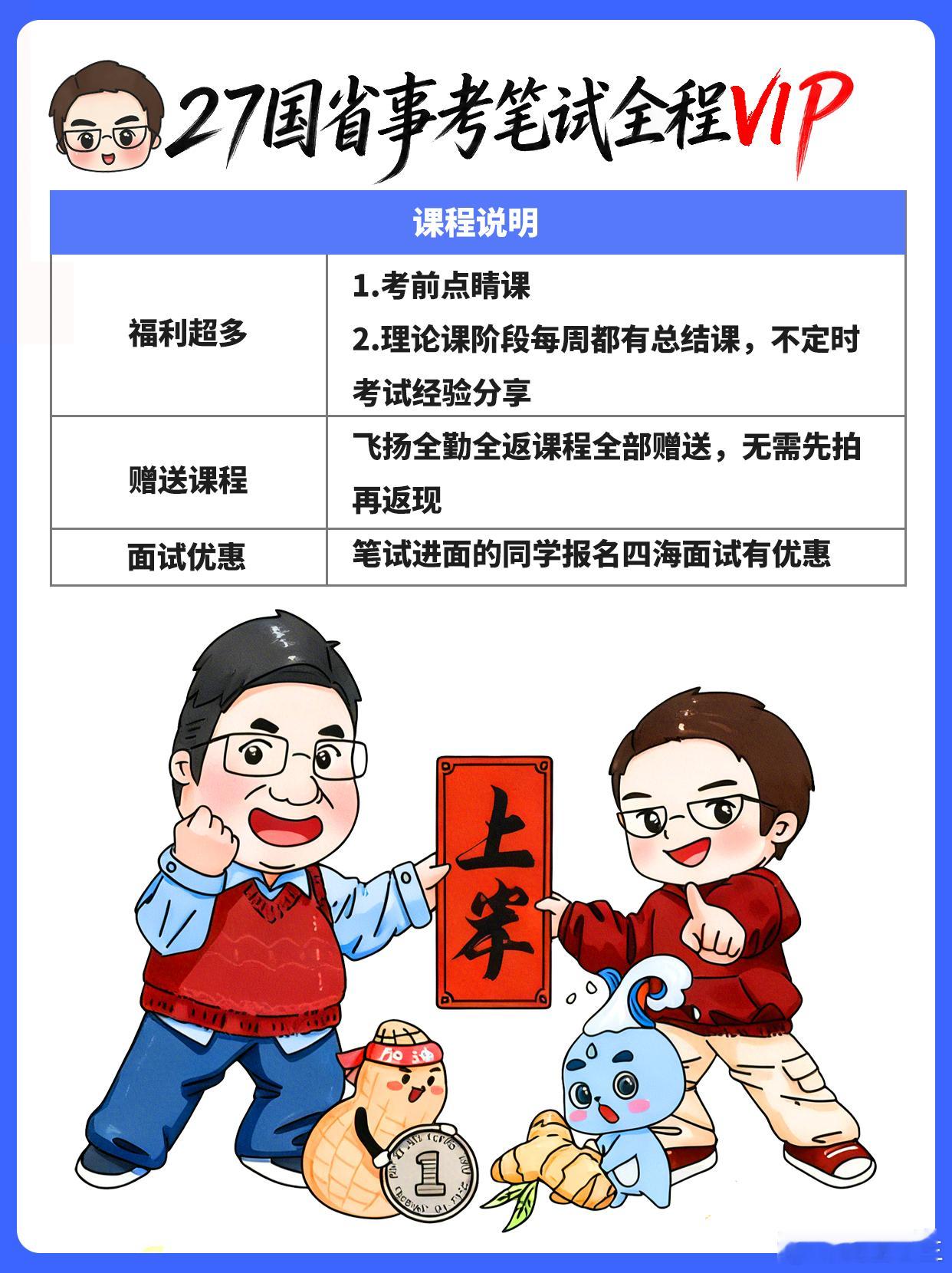 鉴于昨晚同学们的热情,四海公考27年笔试VIP课程(其他单报课程也在尽快推进ing)今天下午2点,可以提前报名!正课从6月末至明年3月末(5月6月600题讲解),适合27国考、27省考小联考、27事业单位考试;这是四海第16年课程,经验无比丰富,课程体系经历无数次实战检验,精准适配考试要求,从理论学习、刷题巩固到套题冲刺,形成闭环式备考模式;同时,课程汇聚一众实战高分+经验丰富的优秀师资(花生飞扬句号打老虎麦朵砰砰冯泽等);本次课程还会推出方法精讲、考前点睛、心得分享等新颖课程,另有优秀名师全新加入,具体安排敬请期待;来吧,加入四海,我们全程直播课程,陪伴你的备考路!国考省考事业单位决战公考