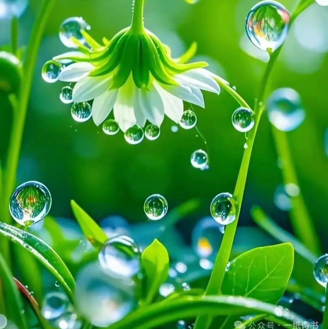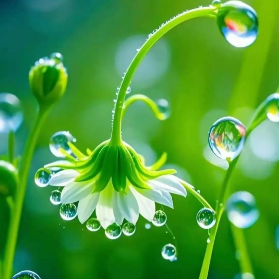 赏花观景:露珠花景 看图写话: 露珠晶莹花间落, 鹤舞雲间紫气升。 翠叶轻摇添秀