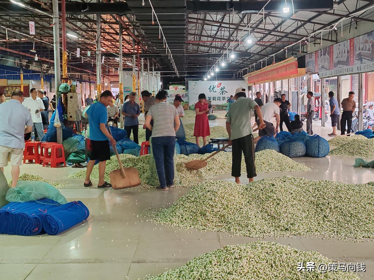 今早实地走访横州茉莉花交易市场,刚到入口就撞见热闹一幕: