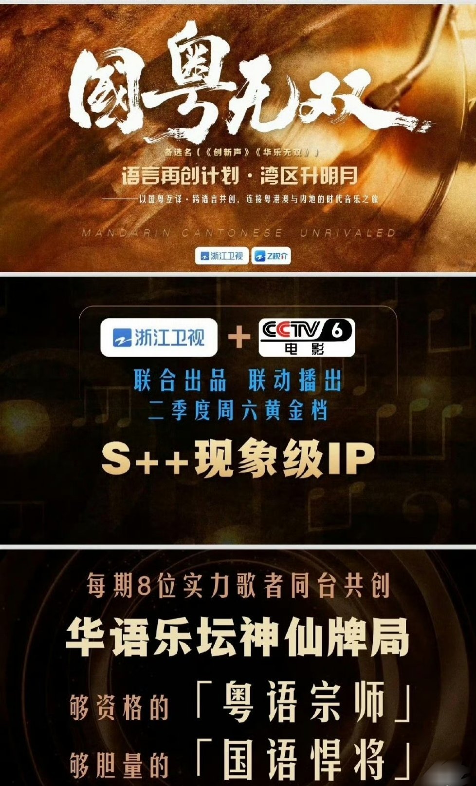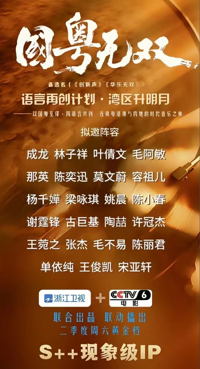 今年歌手都来浙江卫视了《国粤无双》拟邀阵容直接封神!港乐传奇+实力唱将+新生代顶流全员集结!!从林子祥叶倩文的港乐传奇,到陈奕迅那英的实力巅峰,再到王俊凯单依纯的青春力量,每一位都是时代的声音。以国粤互译为桥,以音乐为纽带,这不仅是一场音乐盛宴,更是一次文化的双向奔赴。二季度周六黄金档,坐等开播,共赴这场湾区升明月的音乐之约!