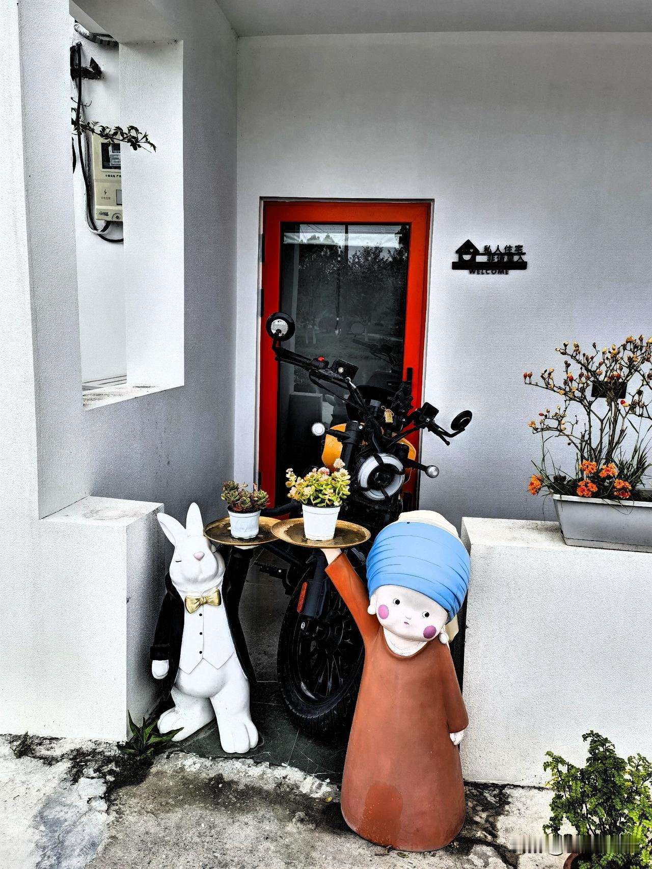 楼下油菜花开得正好,两只青蛙规规矩矩打着伞站在花丛里,神态严肃,在一家门口兔子和村姑各举一个托盘,托盘里放着花盆,像在说“欢迎光临”。