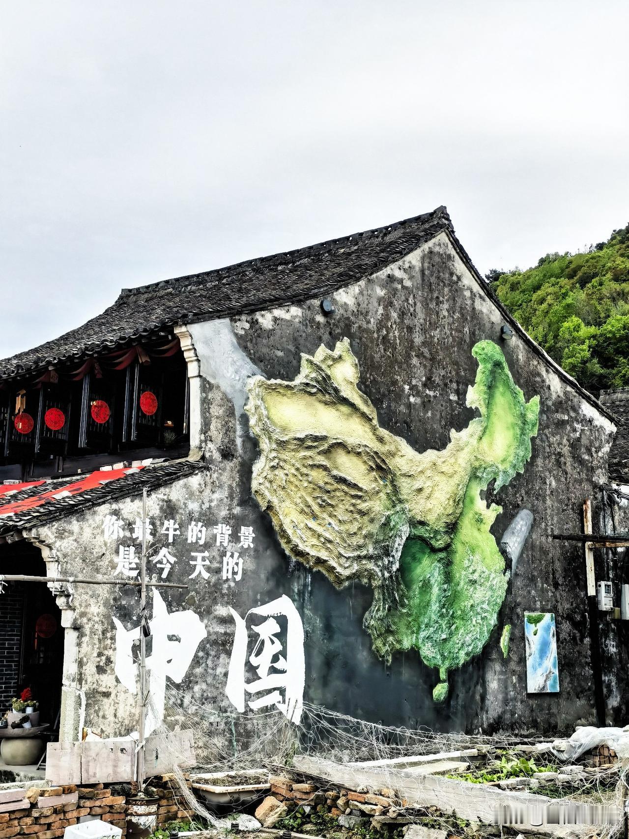 昨天在利民村闲逛,撞见一堵老墙,上面画着抽象的中国地图,旁边一行字:“你最牛的背景是今天的中国”,格外引人注目。旁边二楼的露台上挂着大大的红色蝴蝶结,少女心满满。