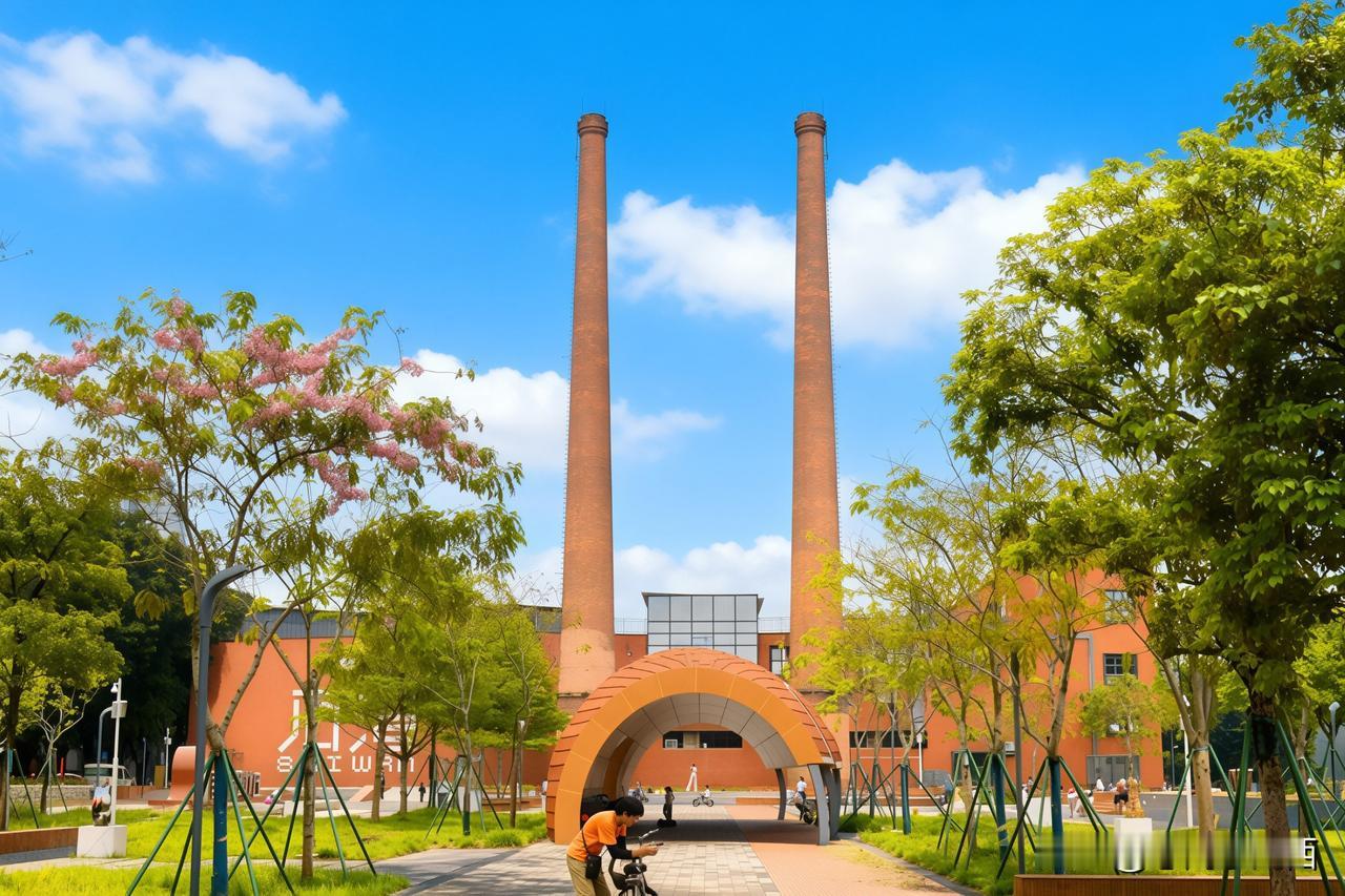 眼前是古灶陶韵公园的红砖地标与标志性双烟囱,工业遗珍与现代绿意和谐共生。
