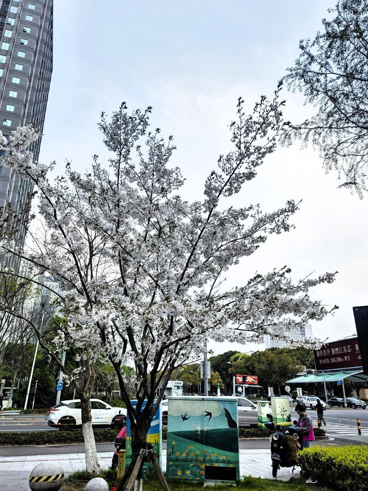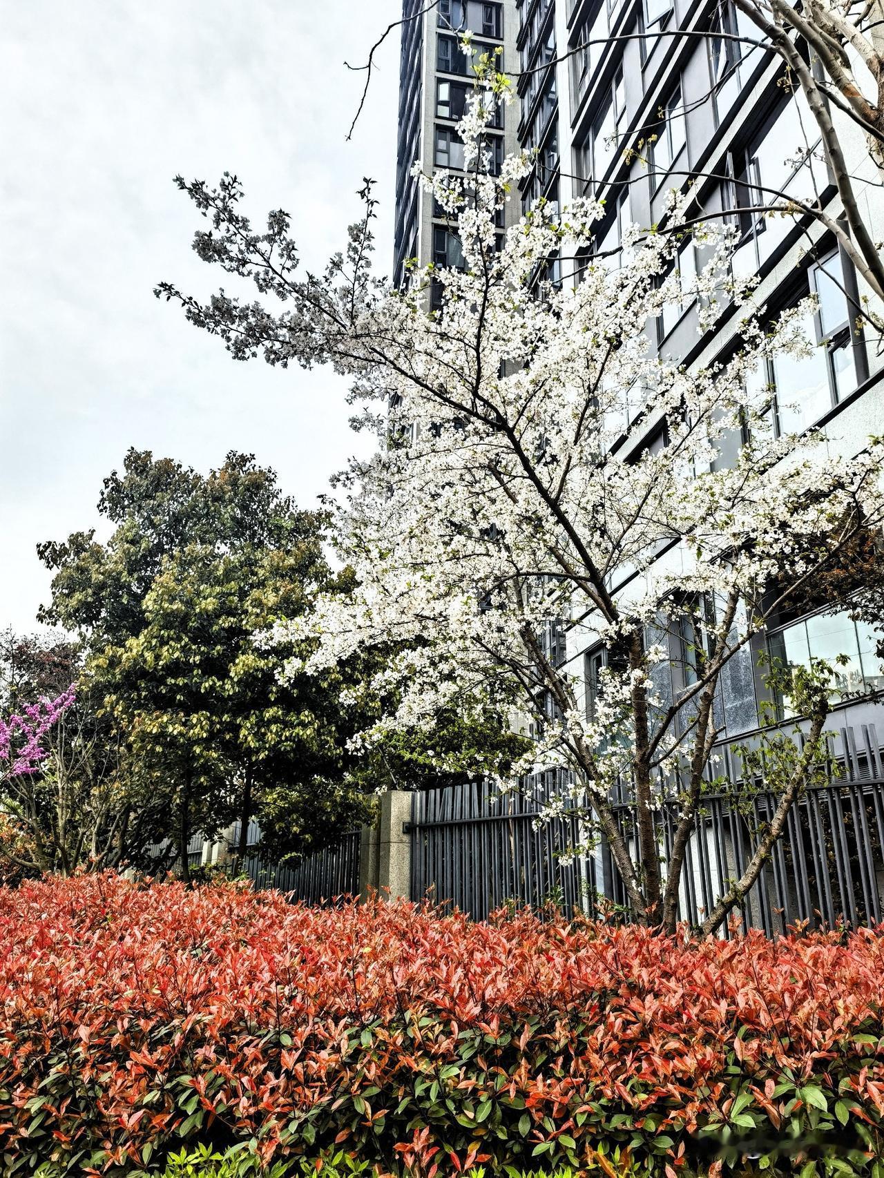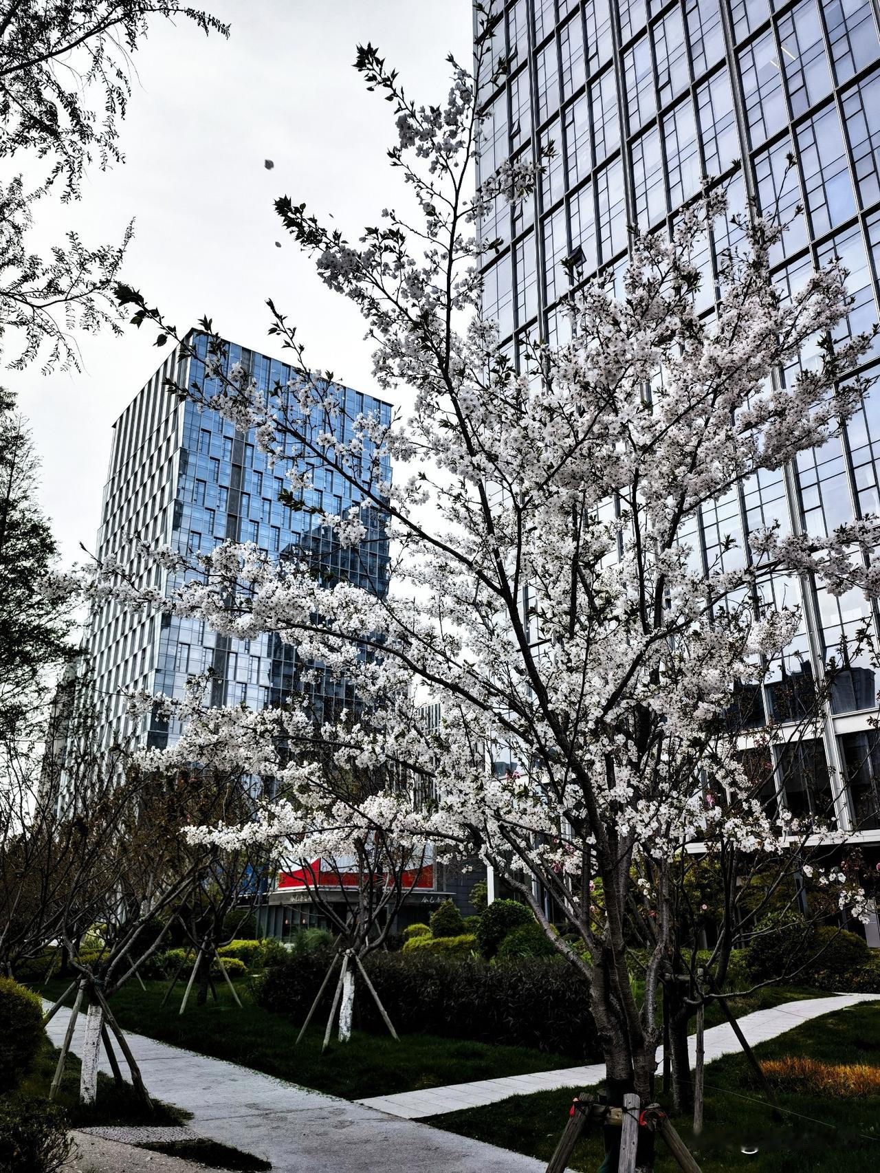 昨晚楼下散步,看到口袋公园里的草地已绿得满满当当,嫩草织成了一片柔软的地毯,绿地上的海棠树,花期已过,大多凋零,只留几朵在风里摇曳。杉树依然光秃,静静等着春天到来,长出新绿。倒是角落那棵樱花树,花开正盛,白色花瓣随风飘洒,香气若有若无地散开,给路人送去春天的风景。