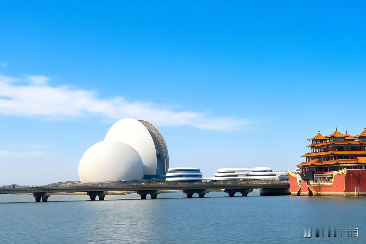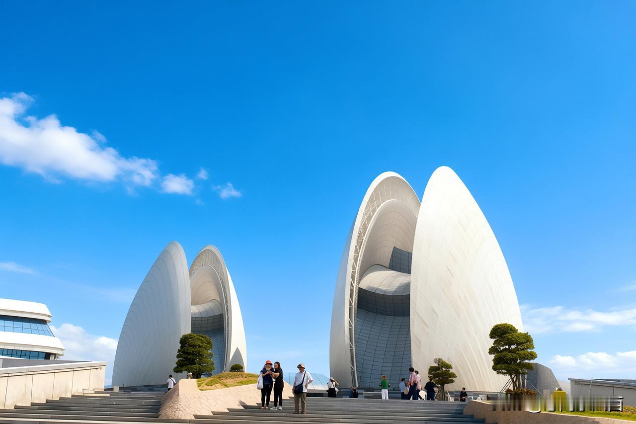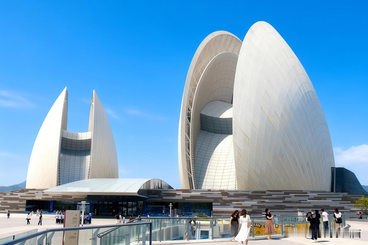 行至菱角嘴拐弯处,珠海渔女静立于碧波之上,手举宝珠,献瑞人间。继续向前,转角便与日月贝深情邂逅,这座巨型贝壳建筑在碧海蓝天的映衬下光彩夺目。