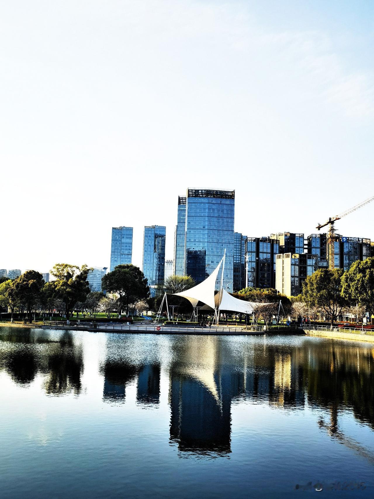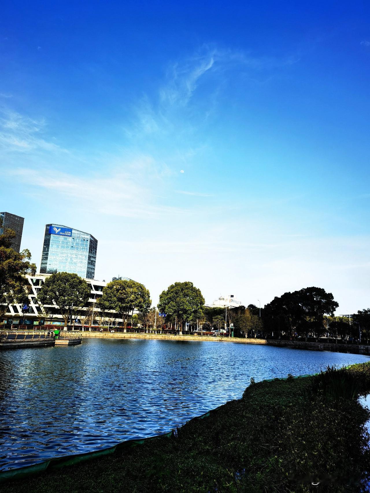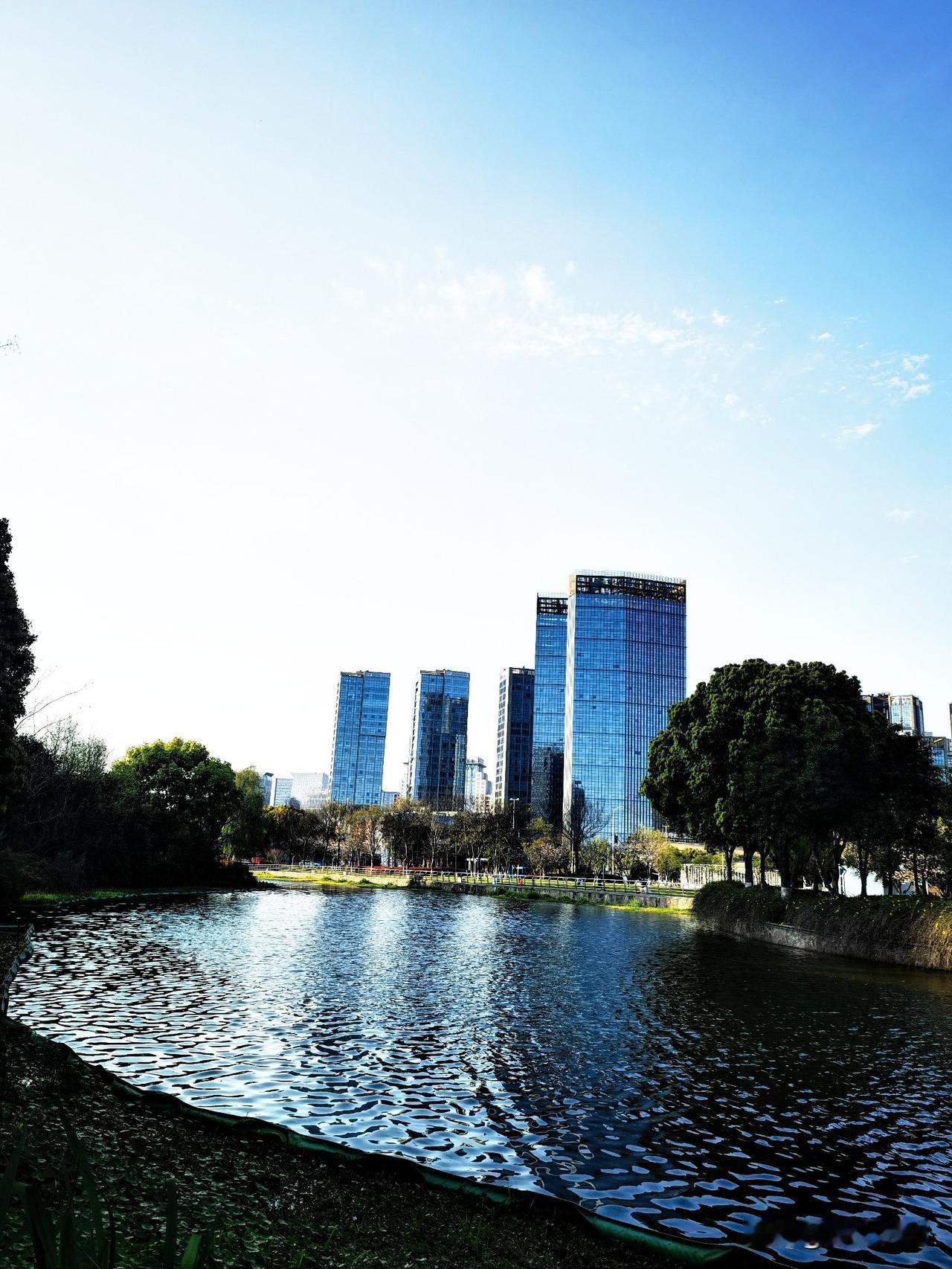 天空是深邃的蓝,幽静深远,把地上的风景都染成了蓝色调,河水难得地平静,微风细波,把对岸的高楼完完整整倒扣在水里,玻璃幕墙反射着最后一缕阳光。