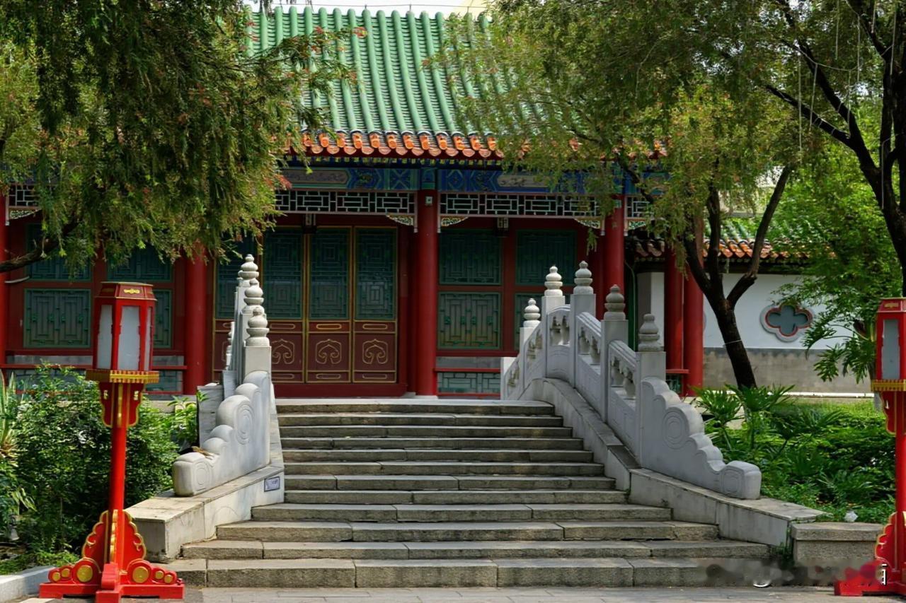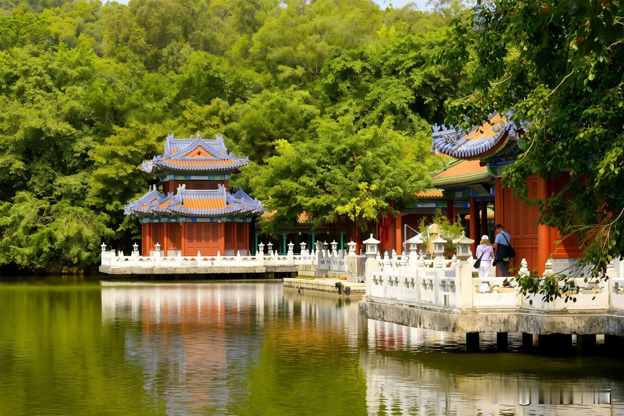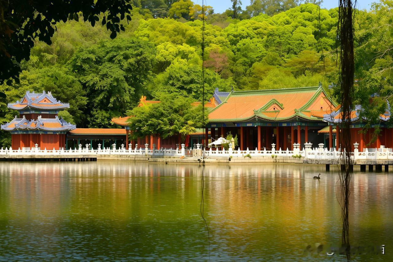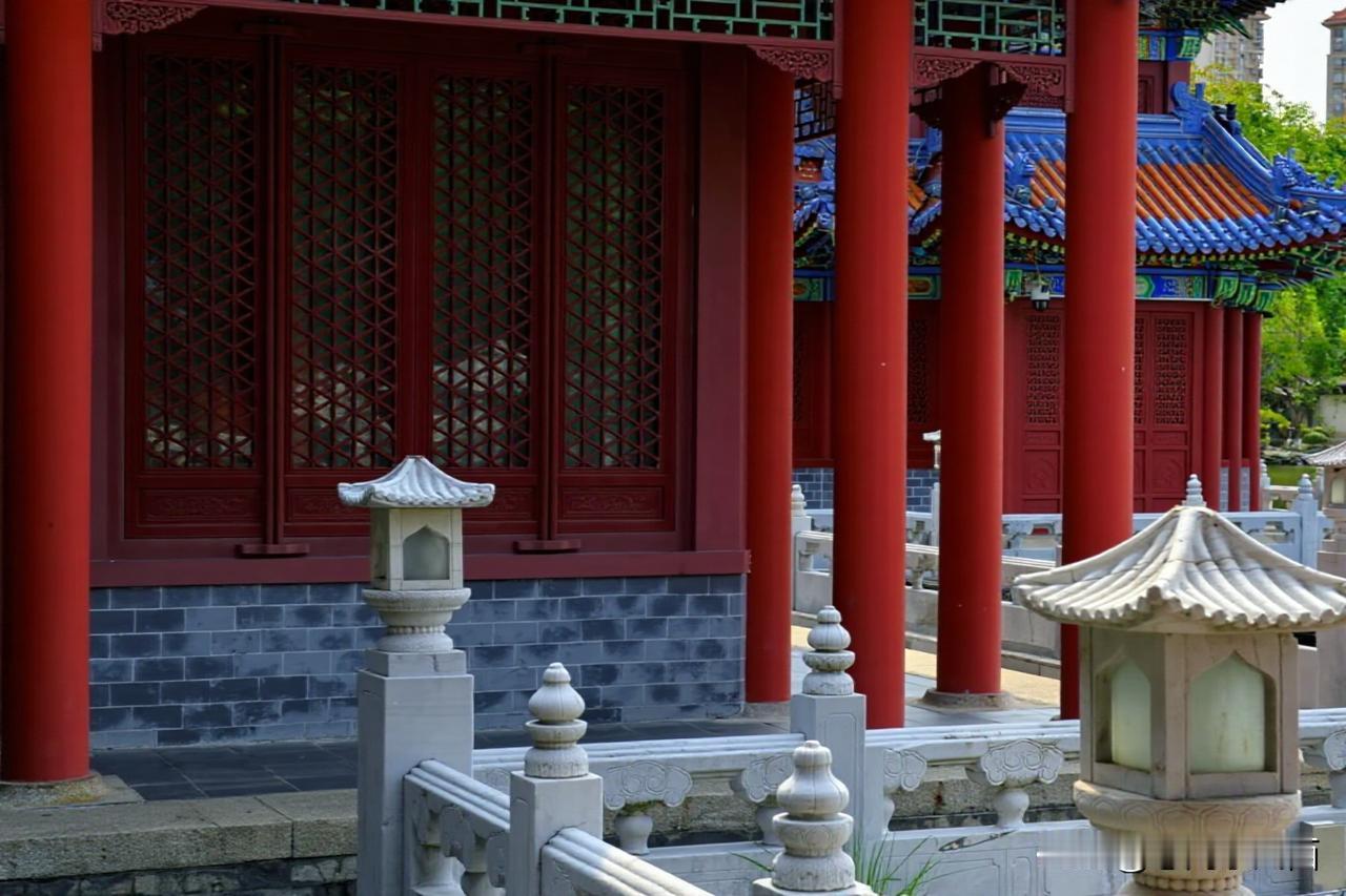 碧水泱泱,白石灯静立湖畔,熏风殿临水倚岸,红廊绿柱映清波,漫步长廊间,雕梁画栋藏着雅致古韵。
