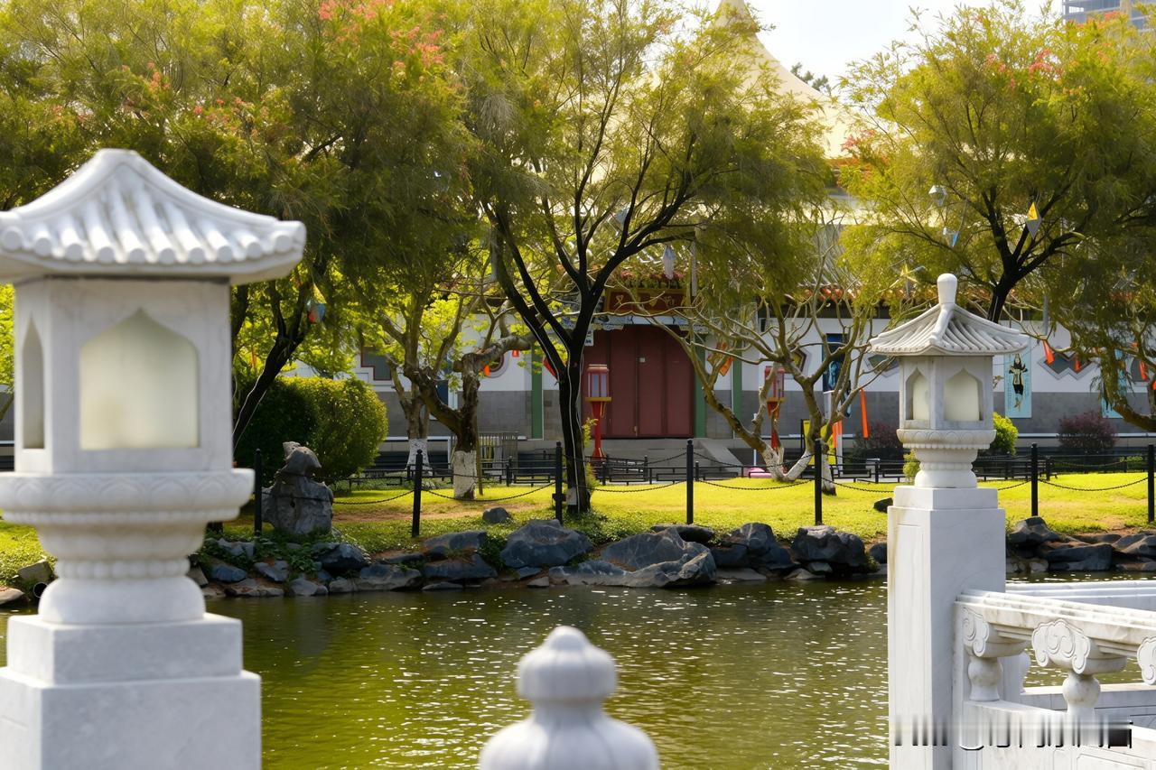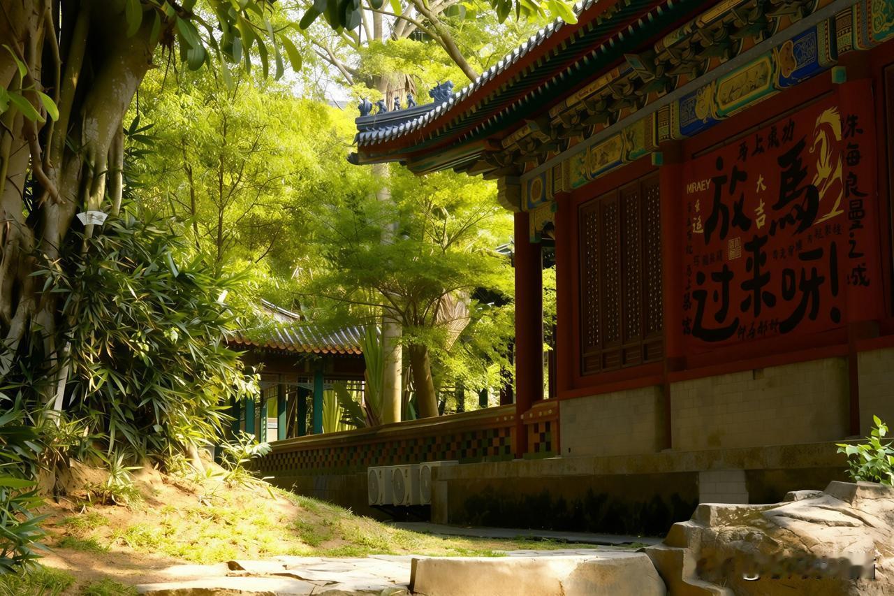 圆明园珠海 圆明新园的风光,是古今交融的绝妙画卷。汉白玉石狮踞守门前,守护红墙黄瓦的威仪;朱门鎏金狮环轻叩,似叩响百年历史的门扉。