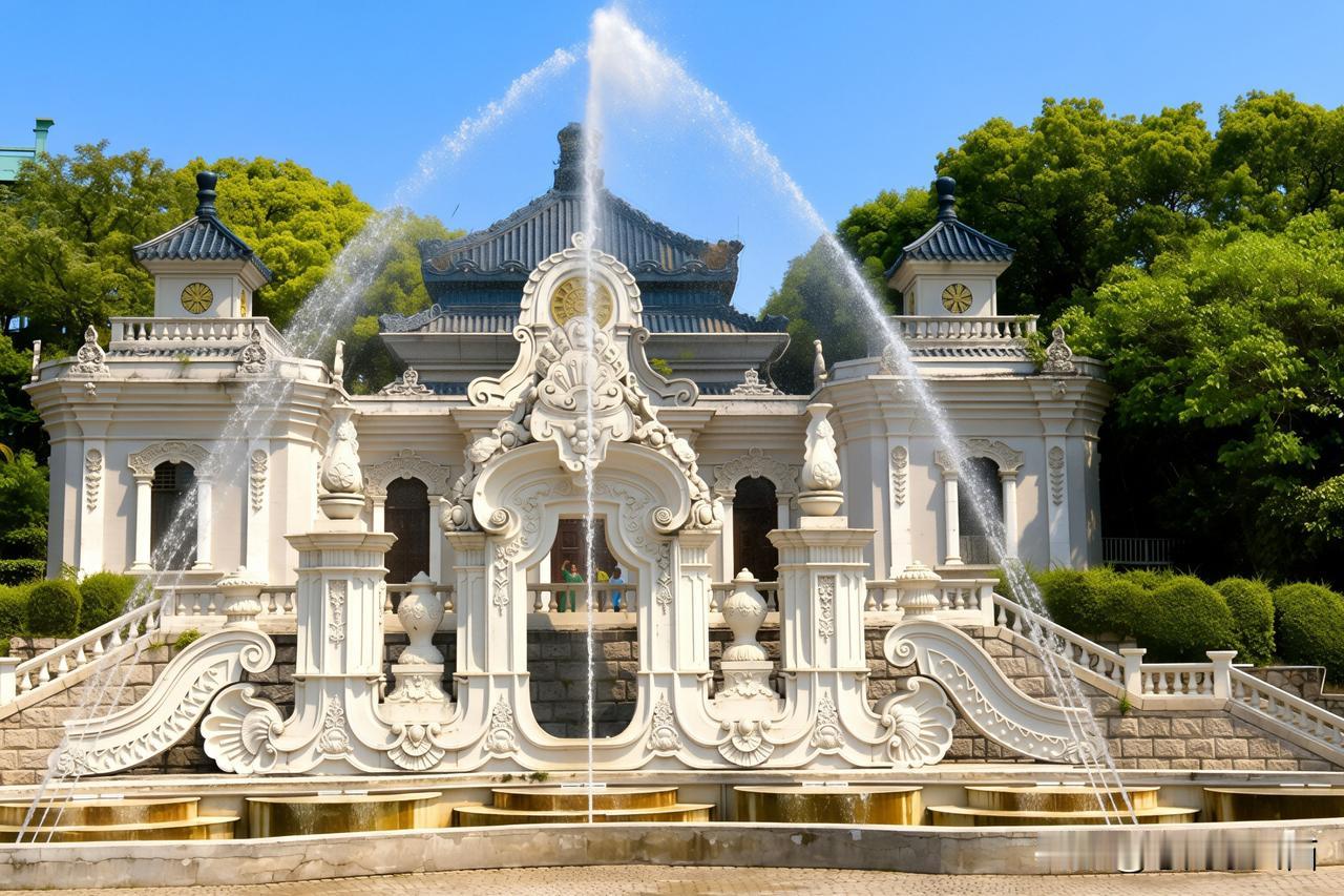 欧式喷泉喷涌出灵动水花,中西建筑相映成趣。一草一木、一砖一瓦,皆将东方古韵与独特风情相融,随手定格,皆是满屏诗意。