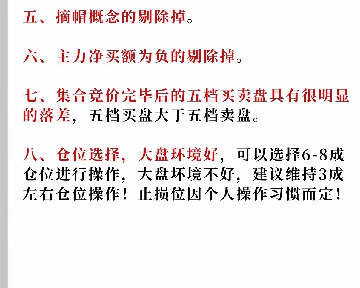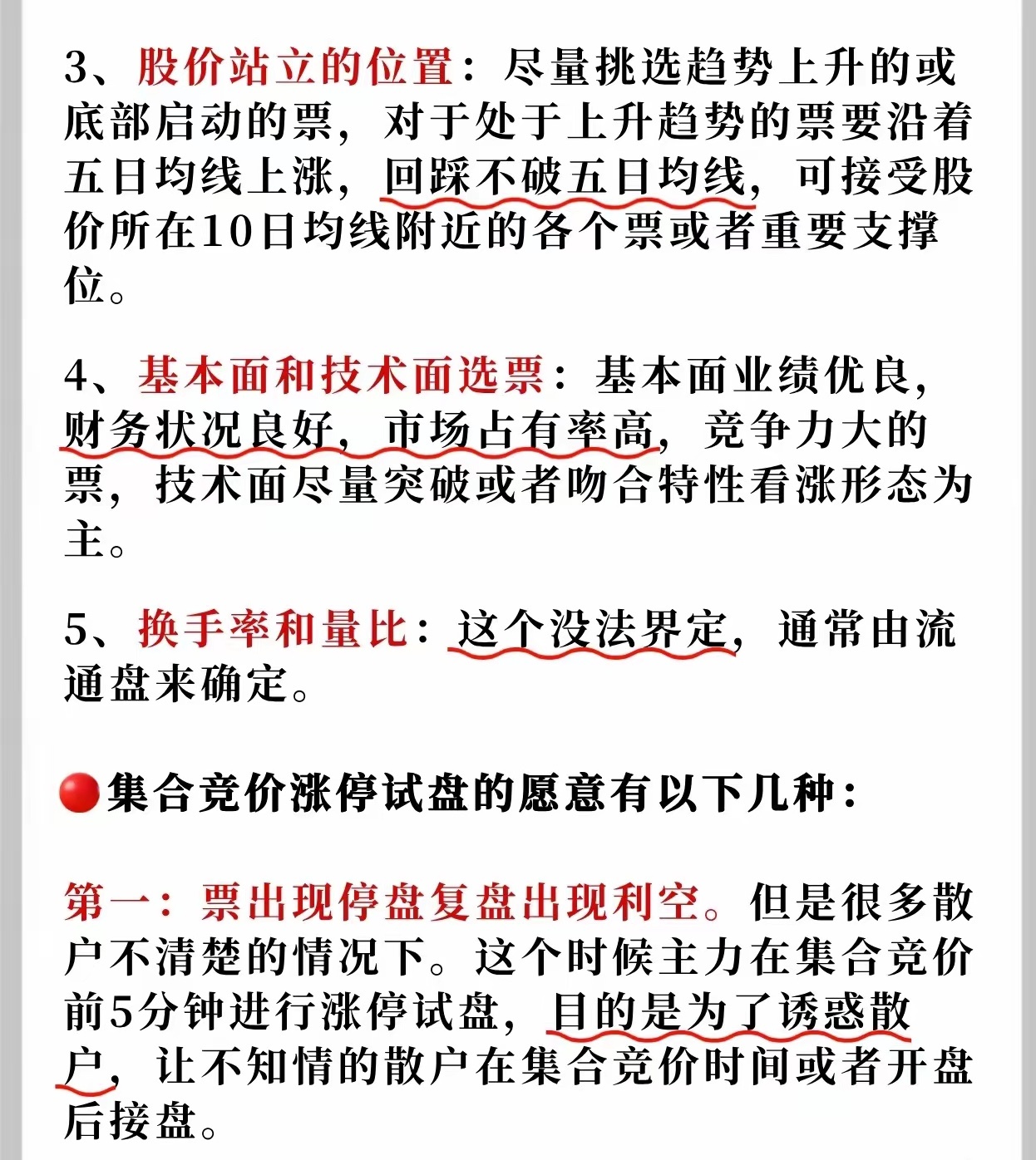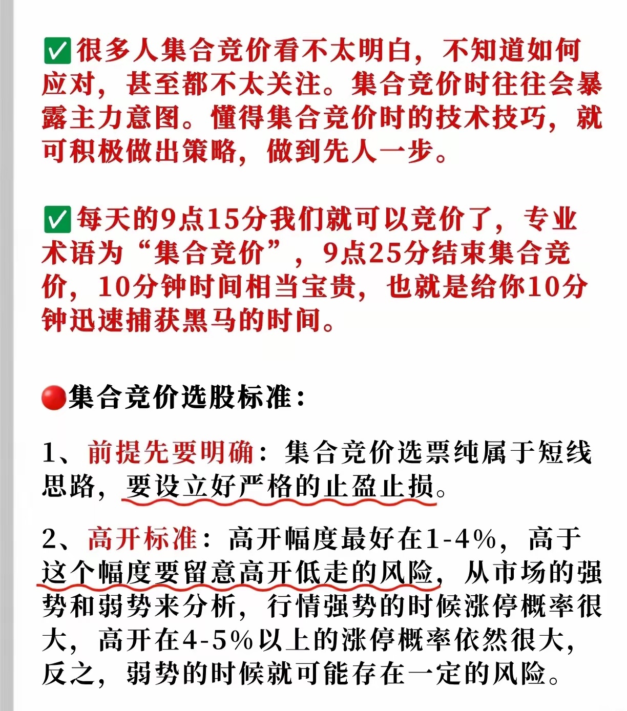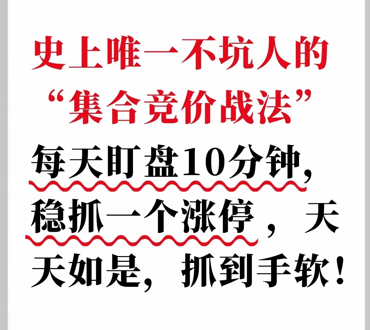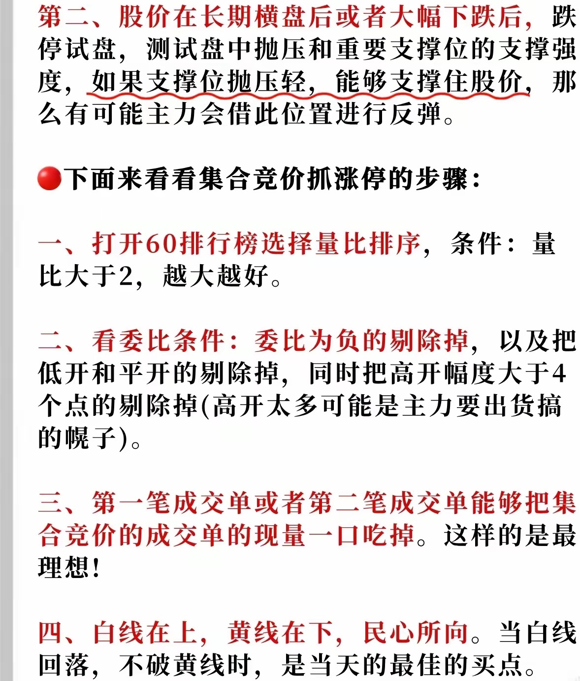 不坑人集合竞价战法(通俗版)这套战法像菜市场早市挑菜,只看真买单,不被吆喝骗,简单好上手、胜率稳定。9:15-9:20是商家虚喊价,可挂可撤,主力常挂涨停诱多后撤单,别当真。9:20-9:25才是实价,不能撤单,这5分钟是核心。好比摊主定好售价,不再改口,价格与成交量最真实。选股看两点:高开2%-5%、竞价量比是昨日3倍以上,红柱买盘远大于绿柱卖盘,如同买菜的人排长队、货源紧俏。高开过高易冲高回落,过低则资金力度不足。开盘后不追急拉,回踩不破开盘价再入场,像等菜价稳了再下手。遇到9:20前强势、之后快速跳水的,直接放弃,避免接盘。战法可用性极高,不搞复杂指标,抓量价真信号,避开主力套路,适合短线稳健操作,新手也能快速掌握。
