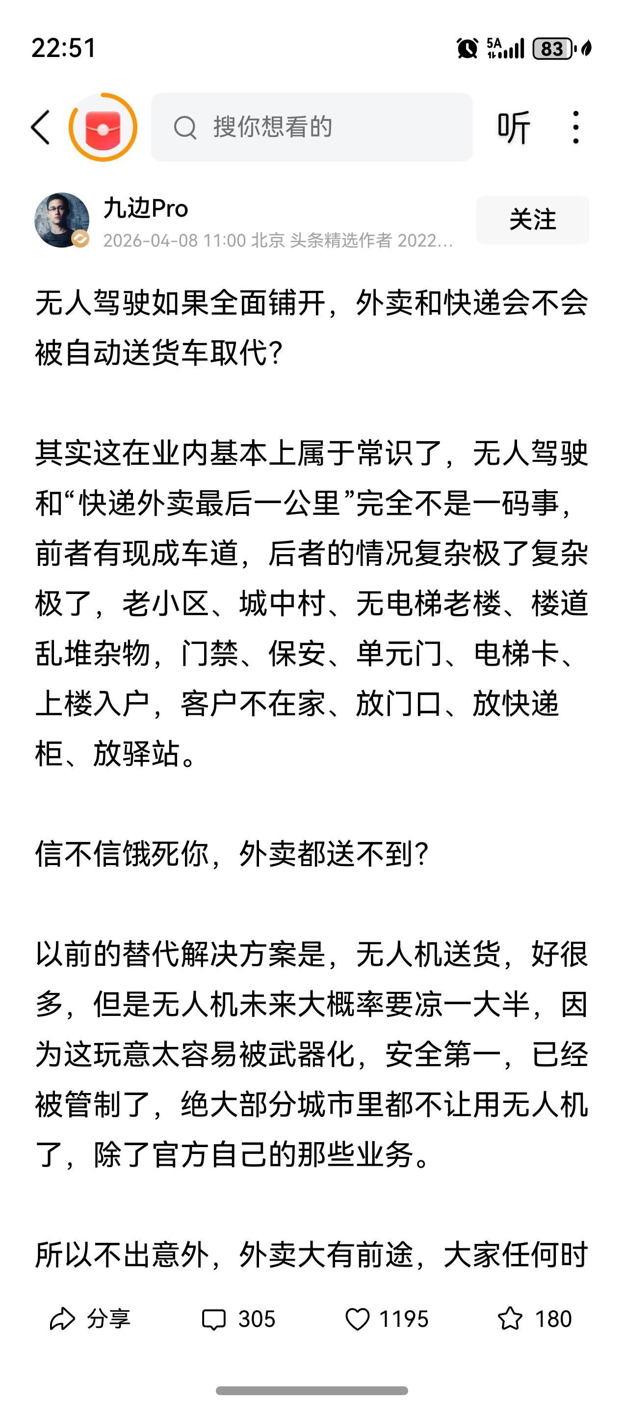 不过九边Pro认为外卖还是有前景的,因为送外卖情况太复杂了,老小区、新小区,有电梯、无电梯,楼道杂物、门铃门禁电梯卡,客户不在家,要打电话联系……等等,情况太复杂,机器人一下搞不定。说的也很有道理。
