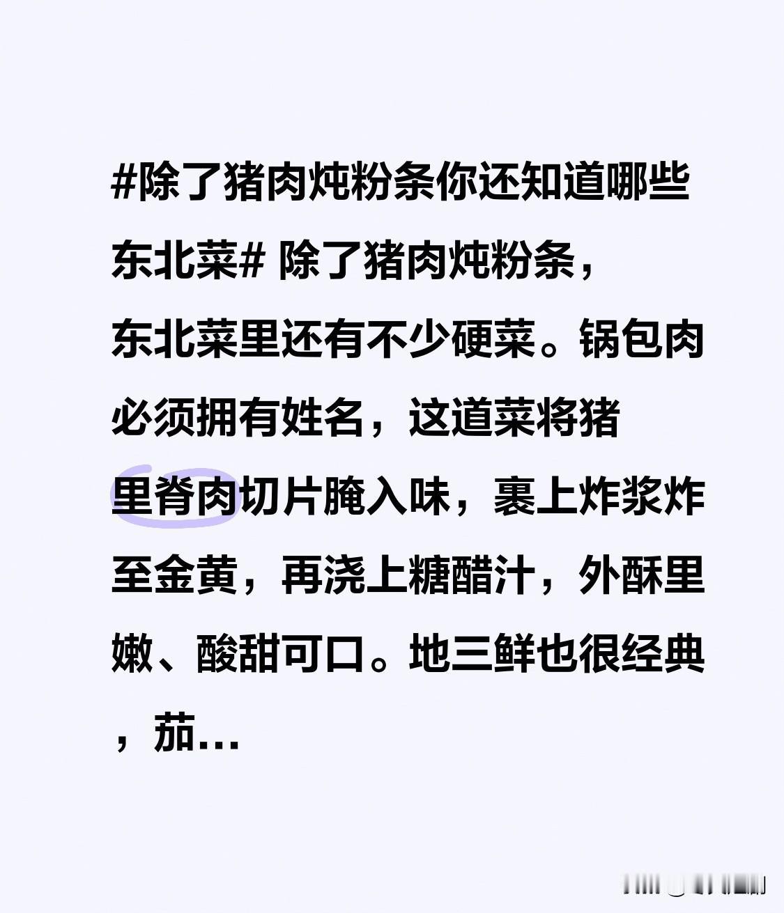 除了猪肉炖粉条,东北菜里还有不少硬菜。锅包肉必须拥有姓名,这道菜将猪里脊肉切片腌入味,裹上炸浆炸至金黄,再浇上糖醋汁,外酥里嫩、酸甜可口。
