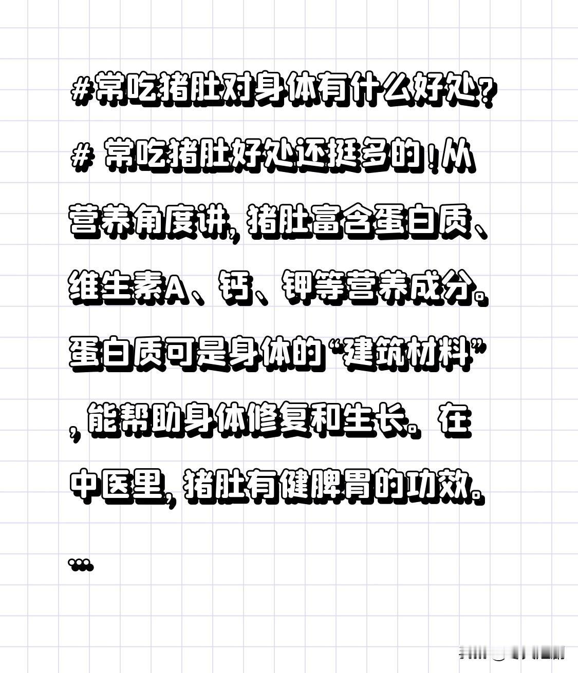 常吃猪肚对身体有什么好处? 常吃猪肚好处还挺多的!从营养角度讲,猪肚富含蛋白质、维生素A、钙、钾等营养成分。蛋白质可是身体的“建筑材料”,能帮助身体修复和生长。
