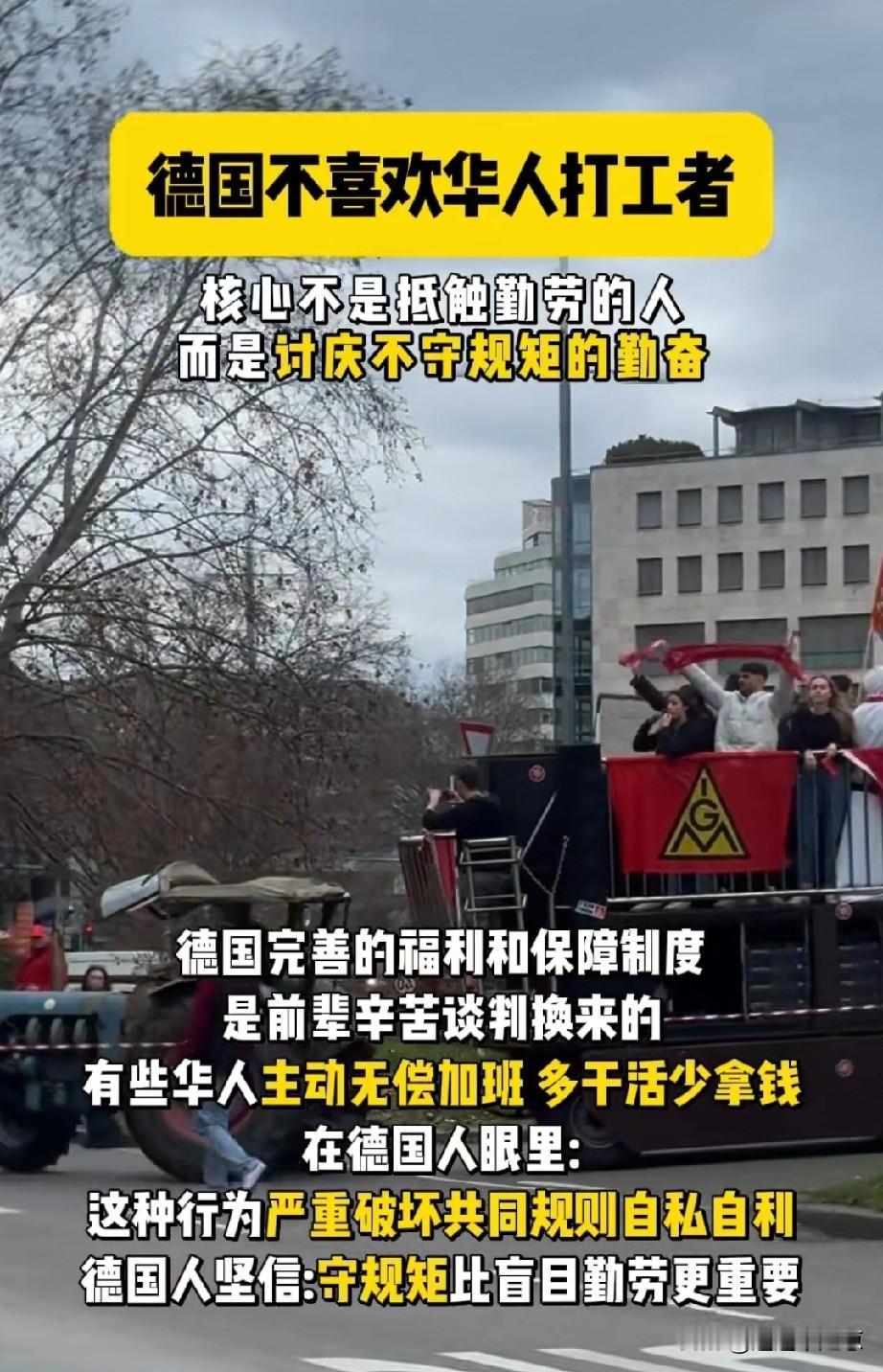 德国工人这一次发起的抗议主要是抗议华人打工者,其核心内容,他们并不是反对或者是排外外来的打工者,而是反对不守规矩的勤奋!德国人说华人无偿干活加班,多干活,少拿钱,在德国人的眼里,这种行为破坏了共同规则,自私自利!德国人坚信守规则比盲目勤奋更重要!德国人说德国完善的福利制度和保障制度是德国先辈谈判的结果!其实说白了,德国是反对国人的内卷代表德国!要知道谈起内卷,全世界没有任何一个国家卷的过咱们,咱们卷起来是无休无止的,就以现在的快递行业来说吧,2块钱一单有大波人干,而且你不干,有的是人干,并且还要送上楼!内卷的结果就是单价越来越低,工资越来越低,干活的人越来越多,无偿加班的人越来越多,形成了一个极具恶性循环的不良商业环境!除去外卖行业,其实在各行各业,都无形的形成了内卷,比如说本来可以准时下班,总有那么一两个显眼包,就在那里加班,无偿加班,老板看到他在加班,以他为标榜,让全公司人跟着一起下班!于是大家都加班形成那个定式,你卷我,我卷你比谁的加班时间更多,比谁下班更晚!所以德国反对华人从业者这种行为也是无可厚非的!这次我支持德国,都出国了了还卷……到最后人又做得累,工资也不见得高多少,慢慢的工作也会越来越难找,换个词,叫破坏生态。
