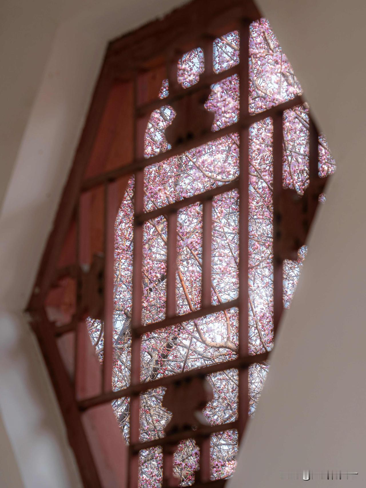 • 花窗框住桃花,氛围感拉满