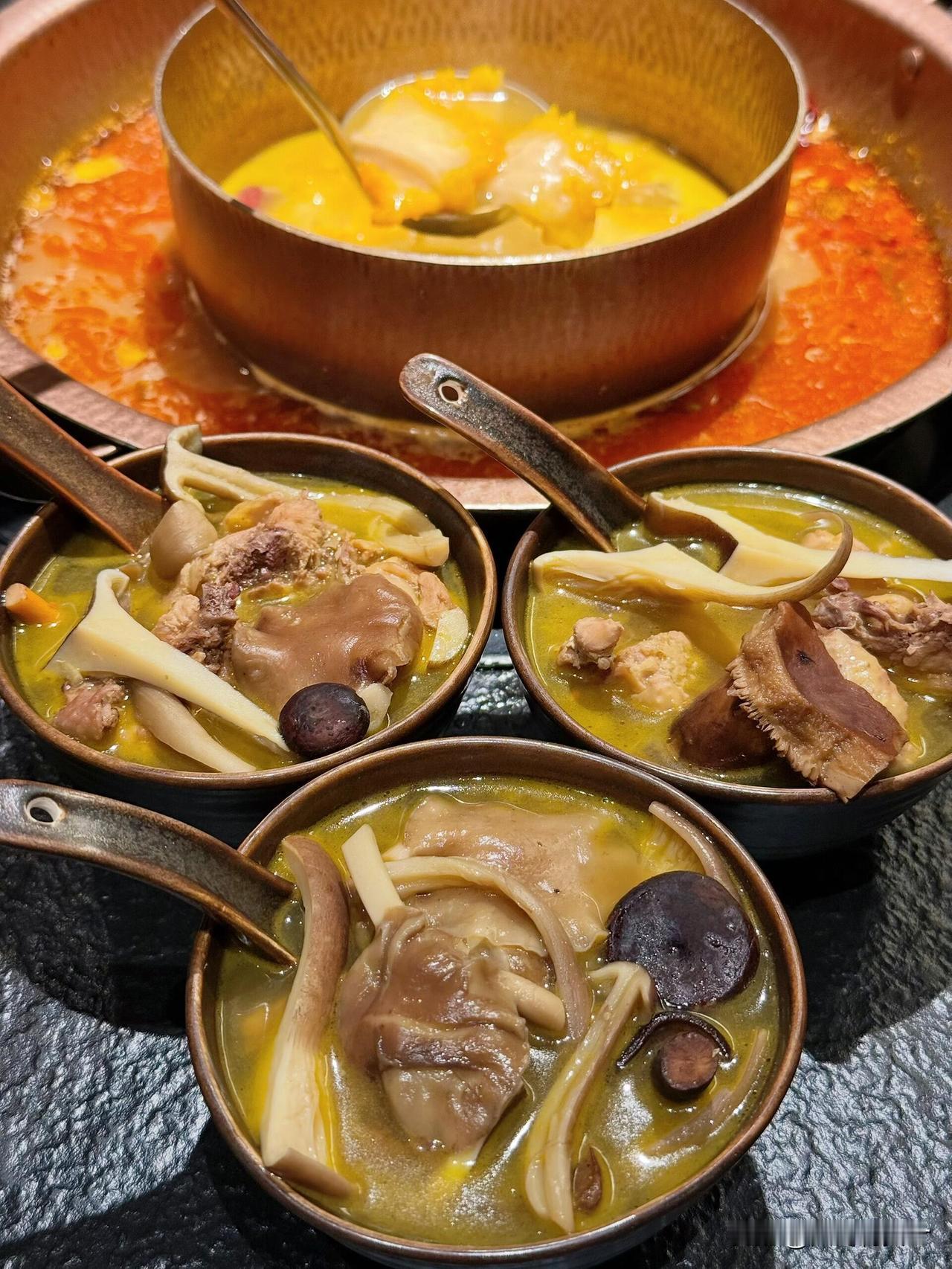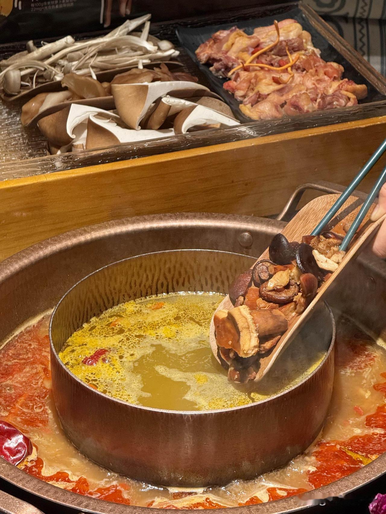 • 走地鸡+野生菌拼锅底:跑山鸡慢炖4小时,搭配牛肝菌、鸡枞菌、竹荪等十余种野生菌,煮16分钟后汤底金黄醇厚,菌香和肉香融合到极致,冬天喝两碗暖到心坎里,土鸡嫩而不柴,吸满汤汁超入味。