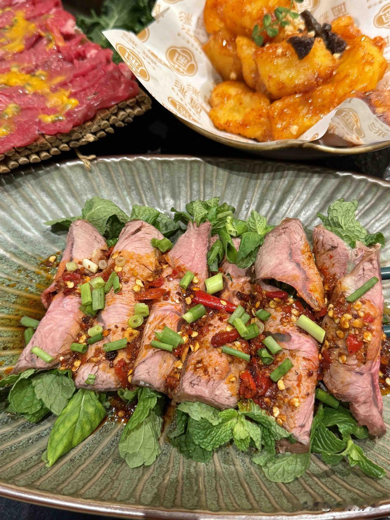 • 薄荷卷牛肉/薄荷木姜子拌牛肉:云南特色款,牛肉软嫩无渣,薄荷的清新中和腻感,涮酸汤锅一口封神,拌料吃更有层次感。