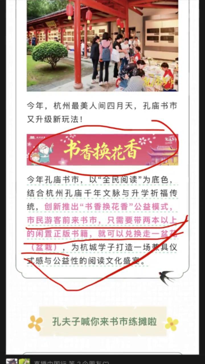 今年孔庙书市以"全民阅读"为底色,结合杭州孔庙千年文脉与升学祈福传统,创新推出"书香换花香"公益模式。市民游客前来书市,只需要带两本以上的闲置正版书籍就可以兑换走一盆(盆栽),为杭城学子打造一场兼具仪式感与公益性的阅读文化盛宴。