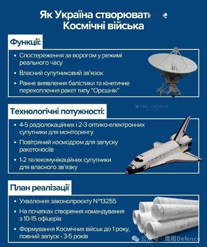 乌克兰的反导系统预计会在一年内出现初步成果,但要想建立完整的太空部队,则需要3到五年,需要4到5颗雷达卫星、2到3颗光电侦察卫星和1到2颗通讯卫星,初期星座成本在1.6亿美元到5亿美元之间。