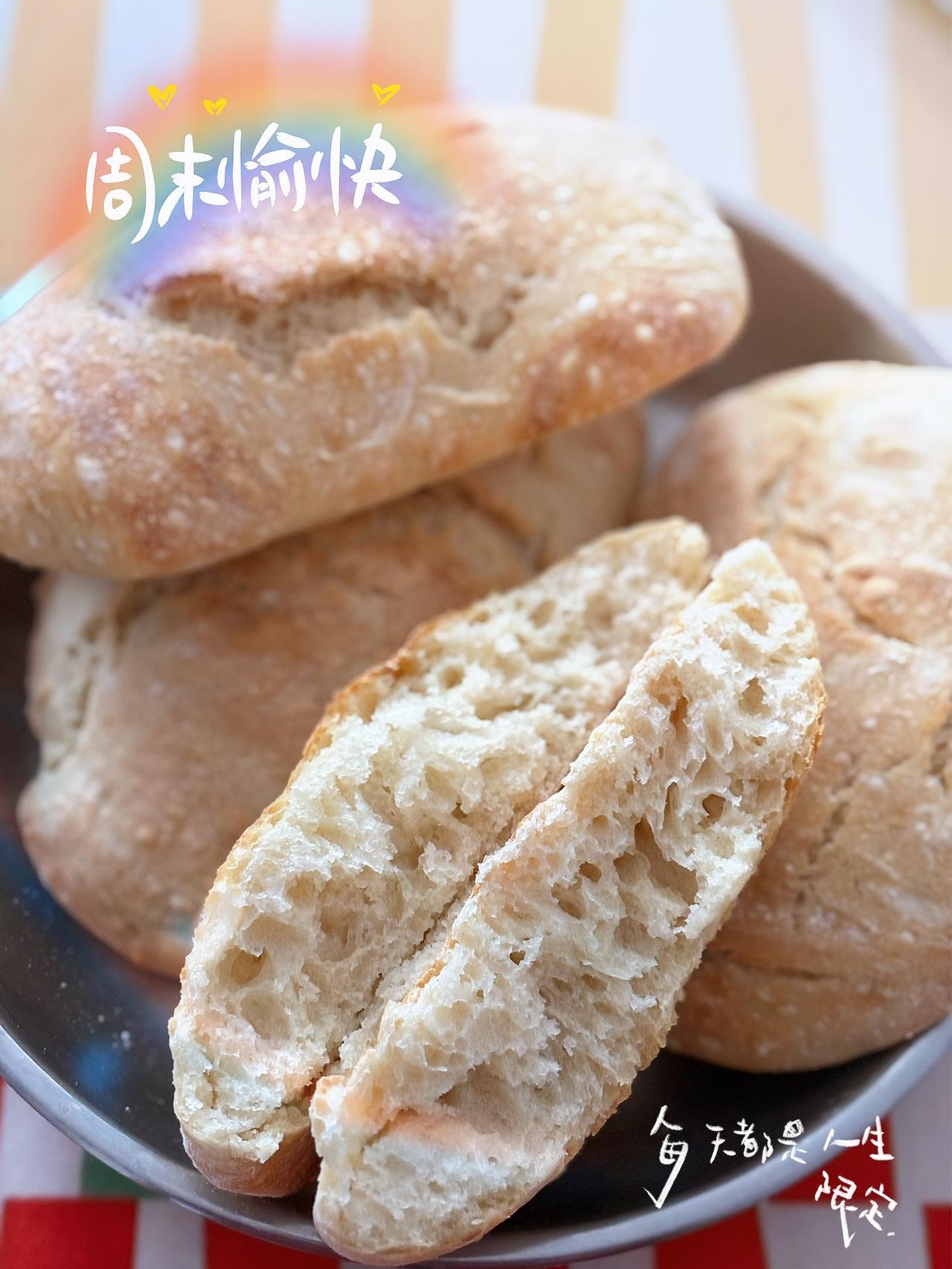 今早烤了一锅免揉版的恰巴塔。