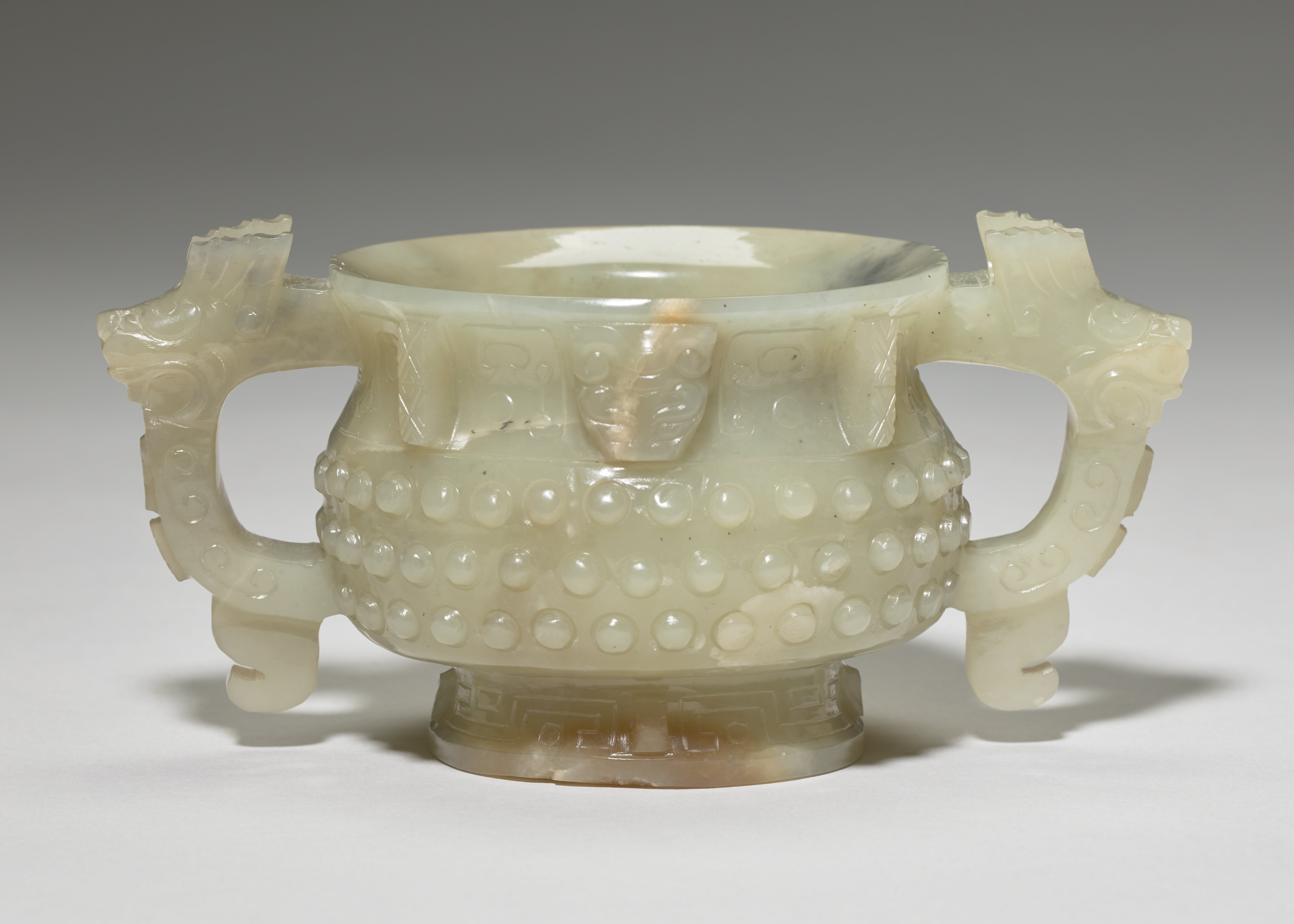 美国明尼阿波利斯美术馆收藏的清代制作的仿先秦铜器 乳钉纹玉簋. 兽食鸟耳搭配乳钉