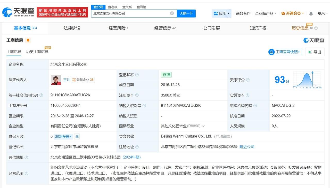 该公司成立于2016年12月,法定代表人为王川,注册资本3500万美元,经营范围包括组织文化艺术交流活动、企业策划、影视策划等,由小米影业香港有限公司全资持股。