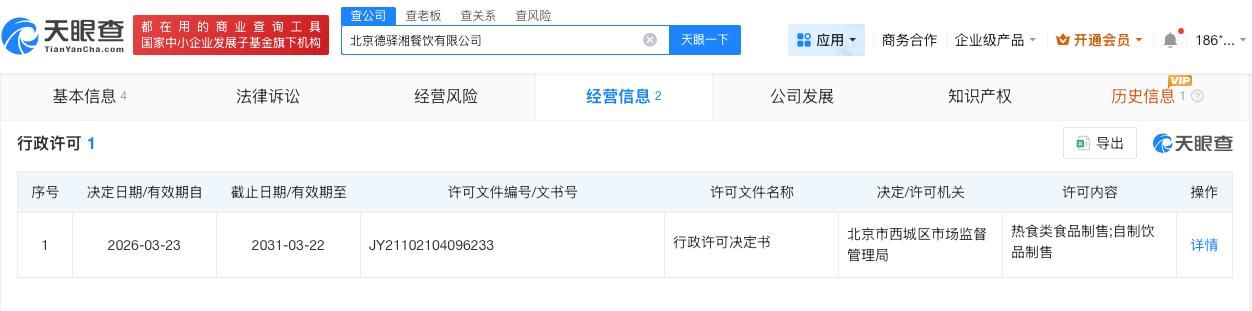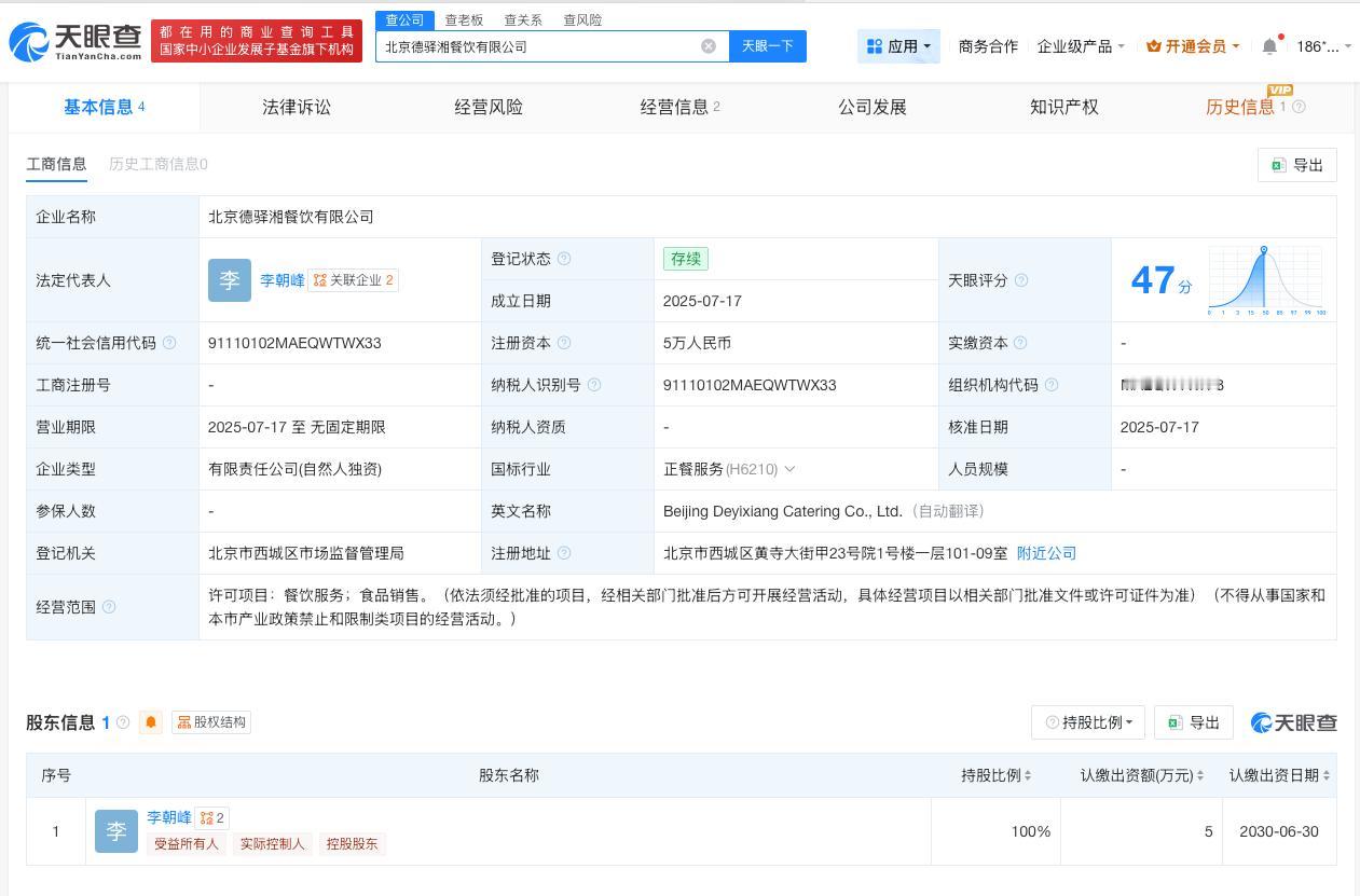 天眼查App显示,该店铺关联公司北京德驿湘餐饮有限公司成立于2025年7月,法定代表人为李朝峰,注册资本5万人民币,经营范围包括餐饮服务、食品销售。股东信息显示,该公司由李朝峰全资持股。