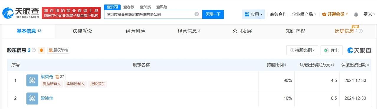 天眼查App显示,涉事医院深圳市联合鹏辉宠物医院有限公司成立于2024年7月,法定代表人为梁英奇,注册资本5万人民币,经营范围为宠物服务、动物诊疗,由梁英奇、梁沛佳共同持股。
