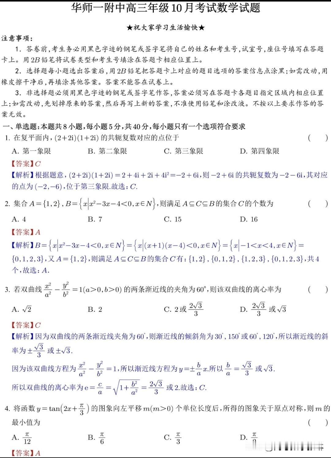 今天给大家分享的是顶级名校华师一附中高三上学期10月月考试题与逐题详解!全卷整体难度较高,题目综合性强,计算量较大,对学生的逻辑推理、空间想象和代数变形能力要求较高。今年高考,华师一附中清北录取人数40+!高分屏蔽生(物理类全省前 20 名)有 3 人;680 分以上 20 人;670 分以上 60 人;660 分以上 113 人。物理类和历史类 600 分以上人数共 882 人,其中物理类 842 人,历史类 40 人。