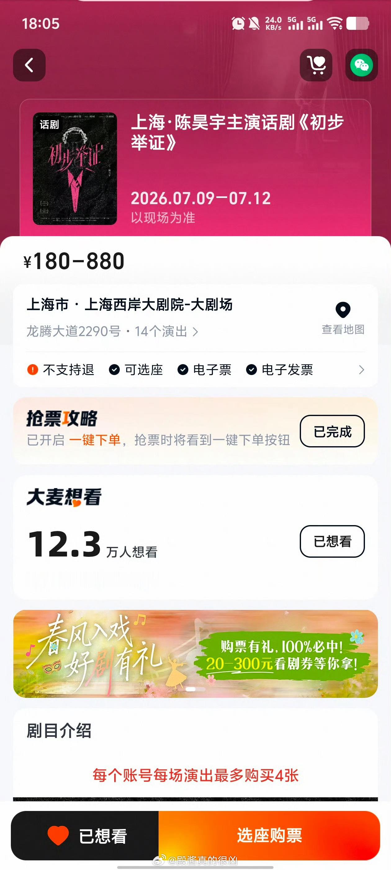 陈昊宇主演话剧大麦想看人数 12.3w猫眼音乐剧话剧热度榜一开票全平台全部秒罄 !!!太火爆了🔥