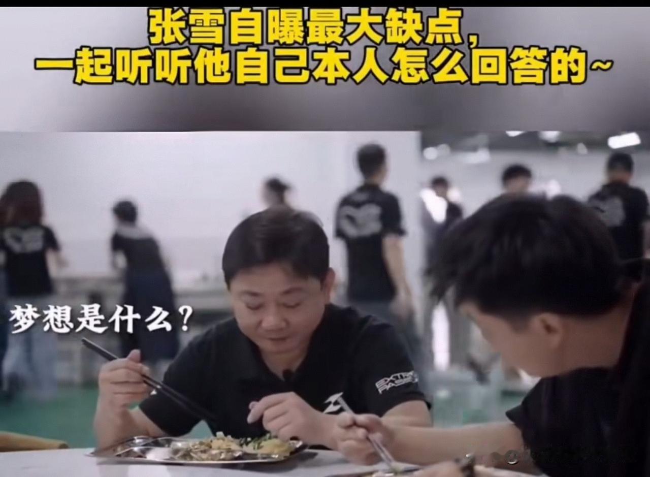 张雪在工厂食堂边吃饭边接受记者采访,画面格外接地气,没有一点老板架子,全程说的都是大实话。