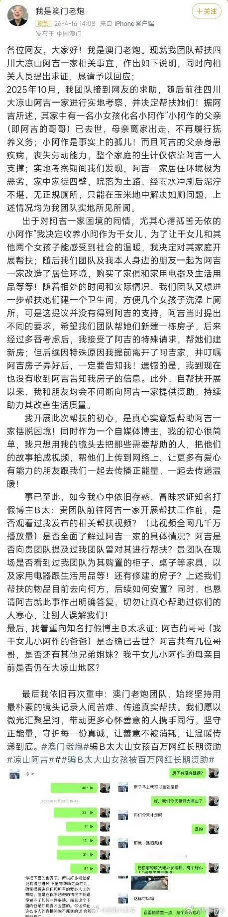 看了下至少5名网红博主帮扶过阿吉一家,纯好奇,大家是怎么都帮扶到同一个人的?澳门老炮喊话B太