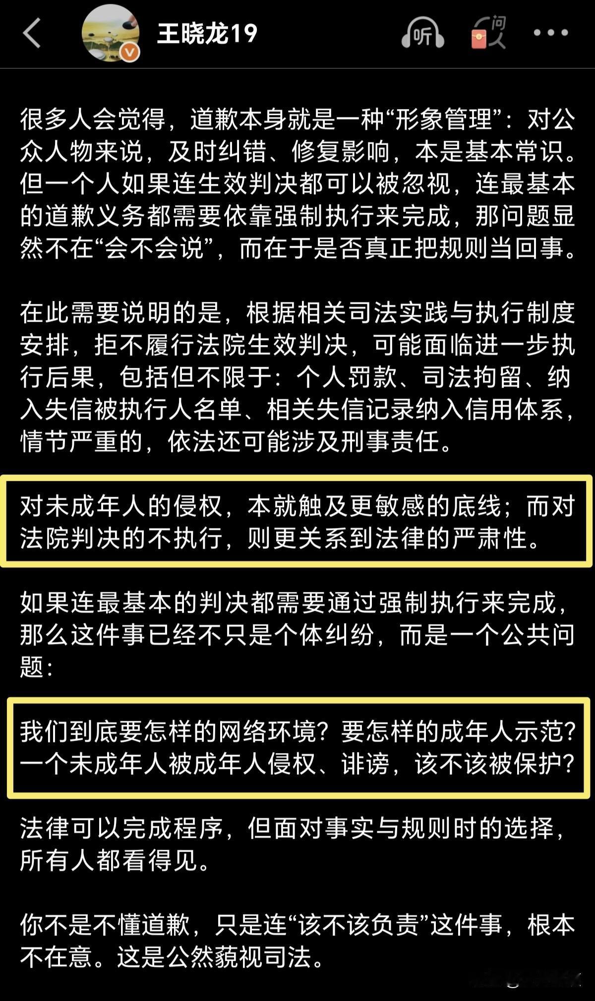 客观而言,成年人之间在互联网上斗嘴被诉,这种事儿倒也无可厚非,但对未成年人的侵权,诽谤,这本就触及更敏感的底线;而对法院判决的不执行,则更关系到法律的严肃性[惊呆]