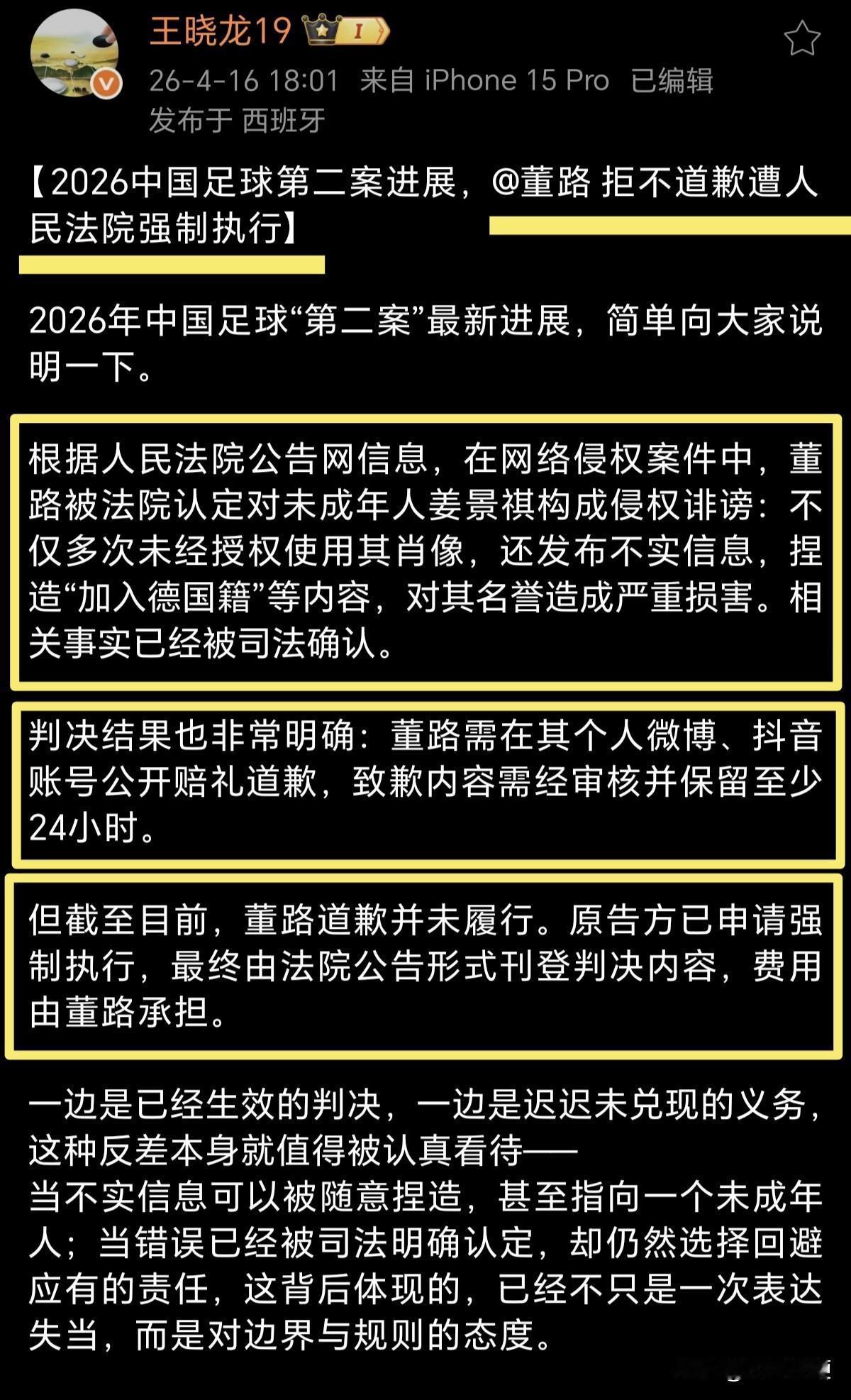 重磅来袭!前国脚王晓龙:董路拒不向未成年人姜景祺道歉,原告方向法院申请强制执行[震惊]