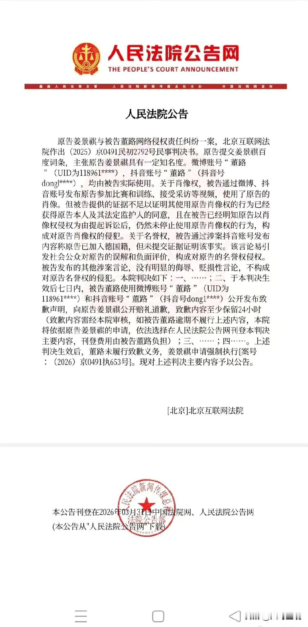 据前国脚王晓龙透露,根据人民法院公告网信息,在网络侵权案件中,董路被法院认定对未成年人姜景祺构成侵权诽谤:不仅多次未经授权使用其肖像,还发布不实信息,捏造“加入德国籍”等内容,对其名誉造成严重损害,相关事实已经被司法确认[加油]