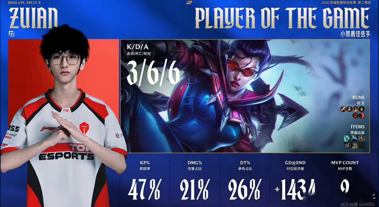 jackeylove好帅的ez BLG对战TES第一局MVP给到Zuian的薇恩,这把连续单杀Bin,完成突破。虽然数据没那么好看,也有些冒进失误,但最后一波与Viper自爆,搅乱战场成为取胜的关键要素之一。
