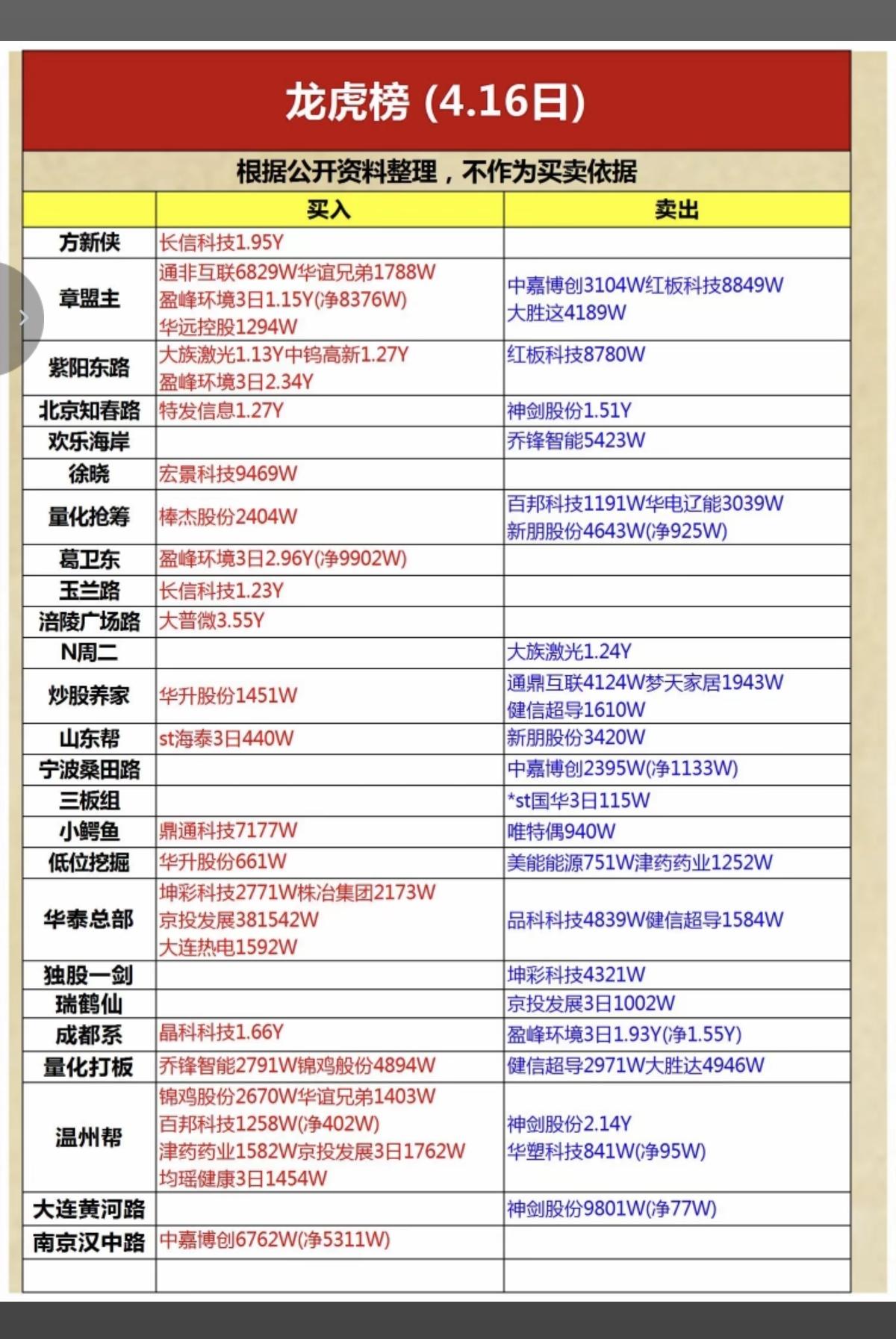 4.16周四 知名游资抢筹 龙虎榜!