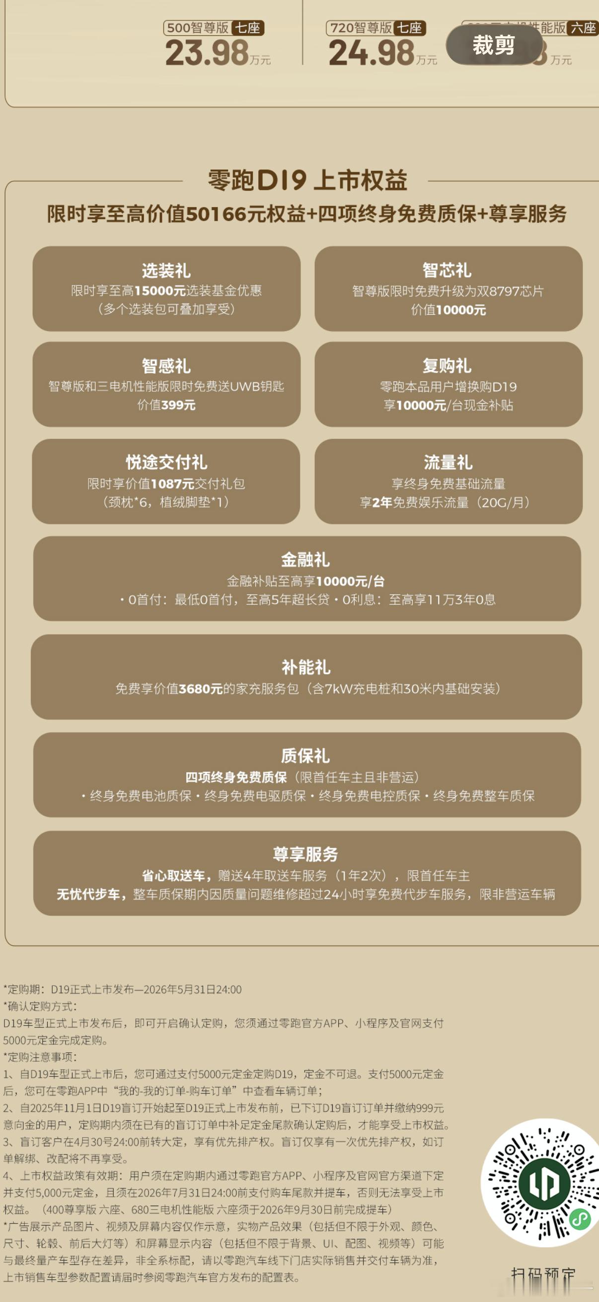 零跑D19这个也太牛逼了,这配置,这价格,还有这么多权益,就冲这个价格,晚点研究