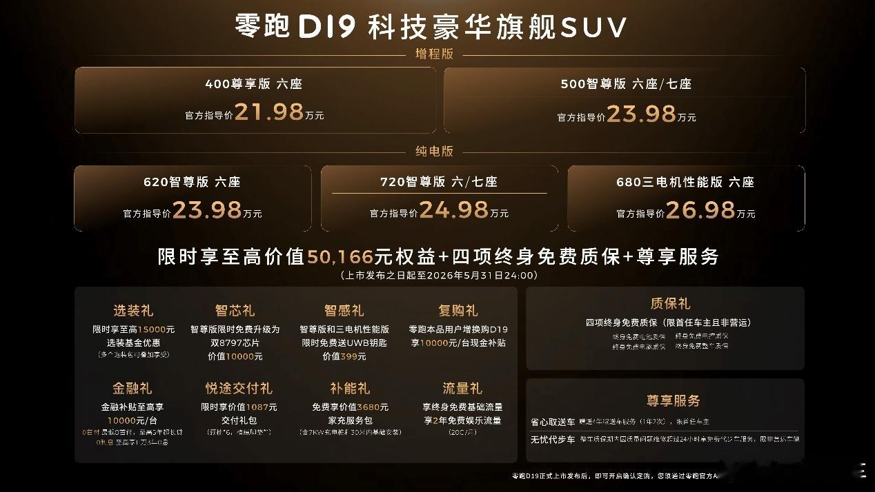 2026年4月16日,零跑旗舰D平台首款车型D19正式上市,售价21.98万至26.98万元。新车以增程500km纯电续航、双高通8797芯片、全栈1000V高压架构等硬核技术,在30万内价位实现百万级全维体验,推出六座/七座、增程/纯电多版本选择。作为十年技术沉淀之作,D19凭借全域自研打破“旗舰即高价”行业惯例,从车规级制氧机到VLA大模型辅助驾驶,重新定义全尺寸SUV价值标准。 零跑汽车