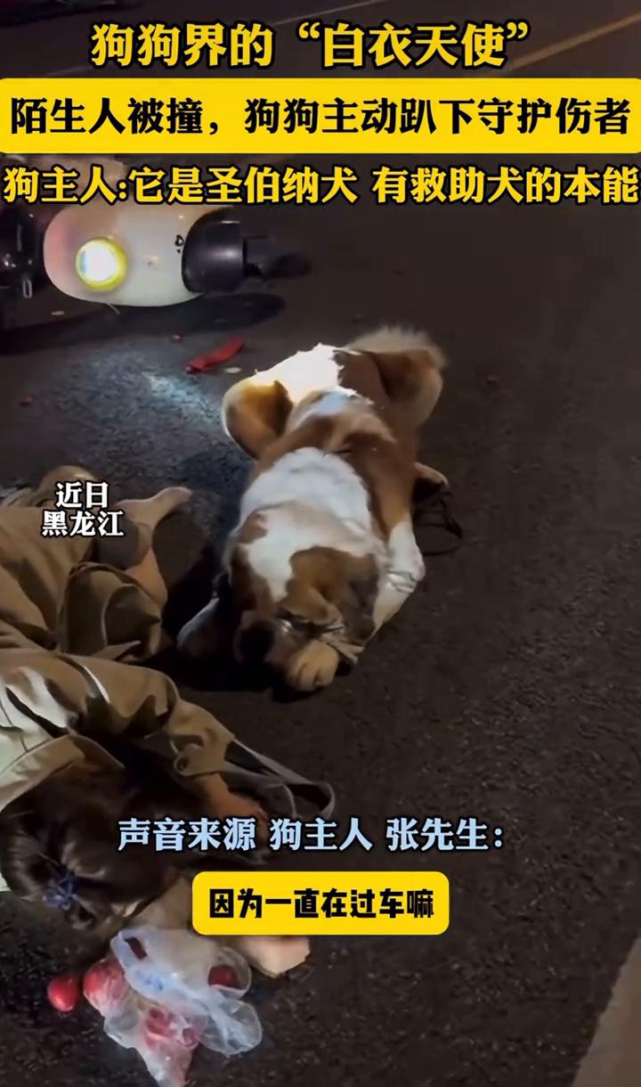 狗狗界的"白衣天使",陌生人被撞,狗狗主动趴下守护伤者。 狗主人:它是圣伯纳犬,