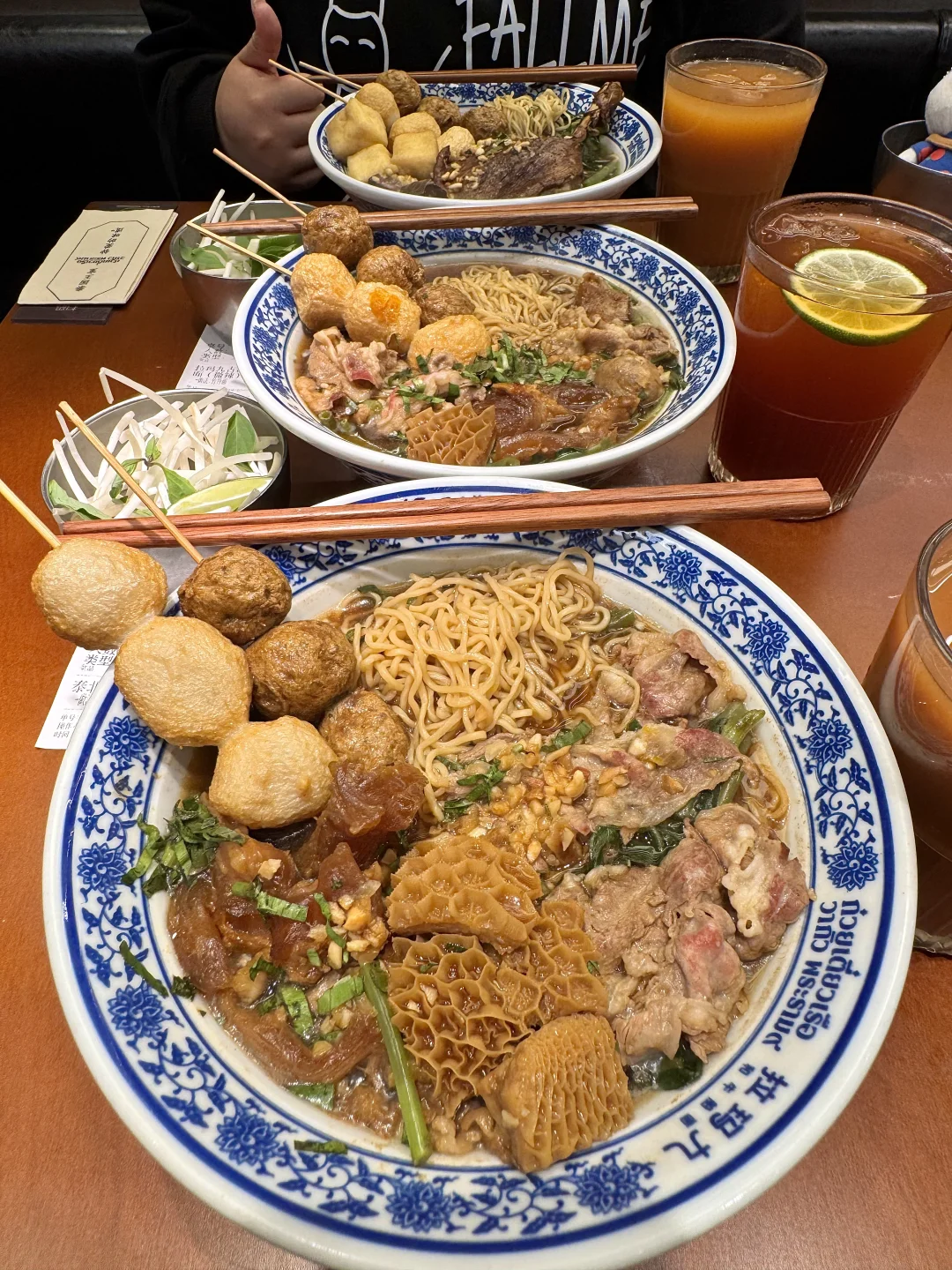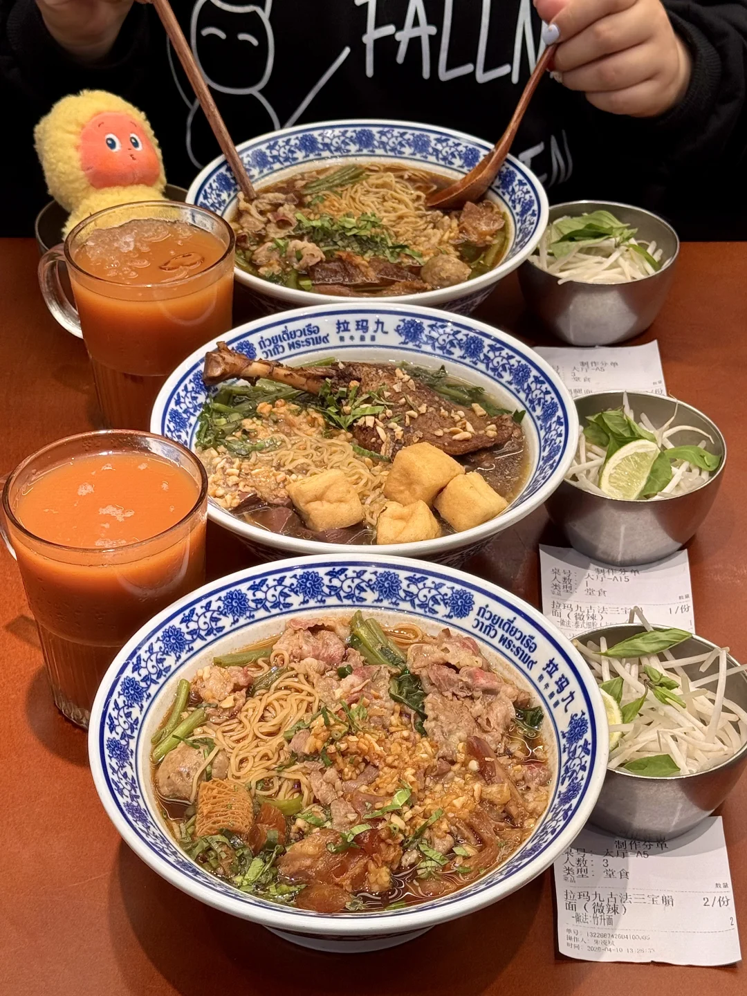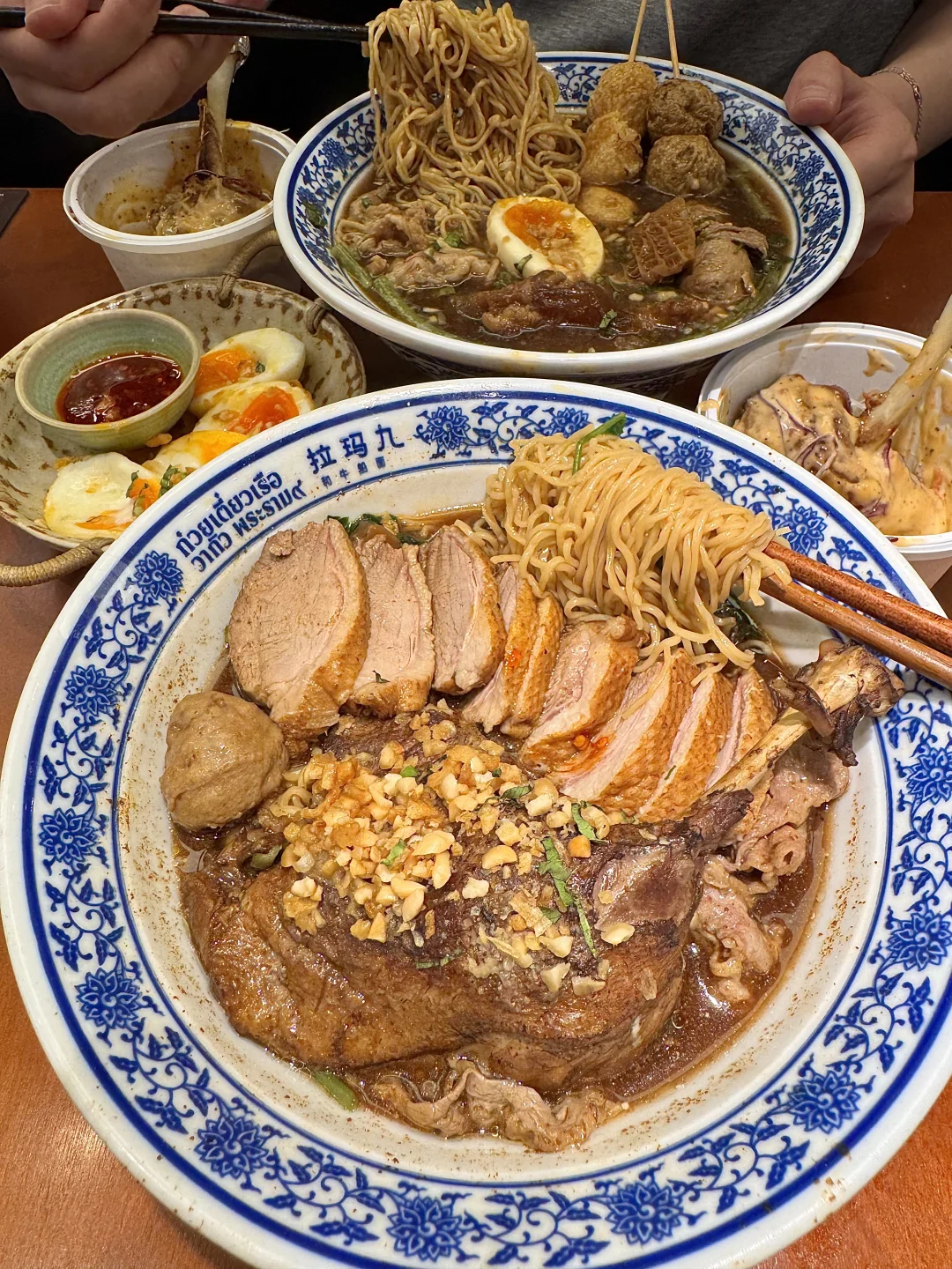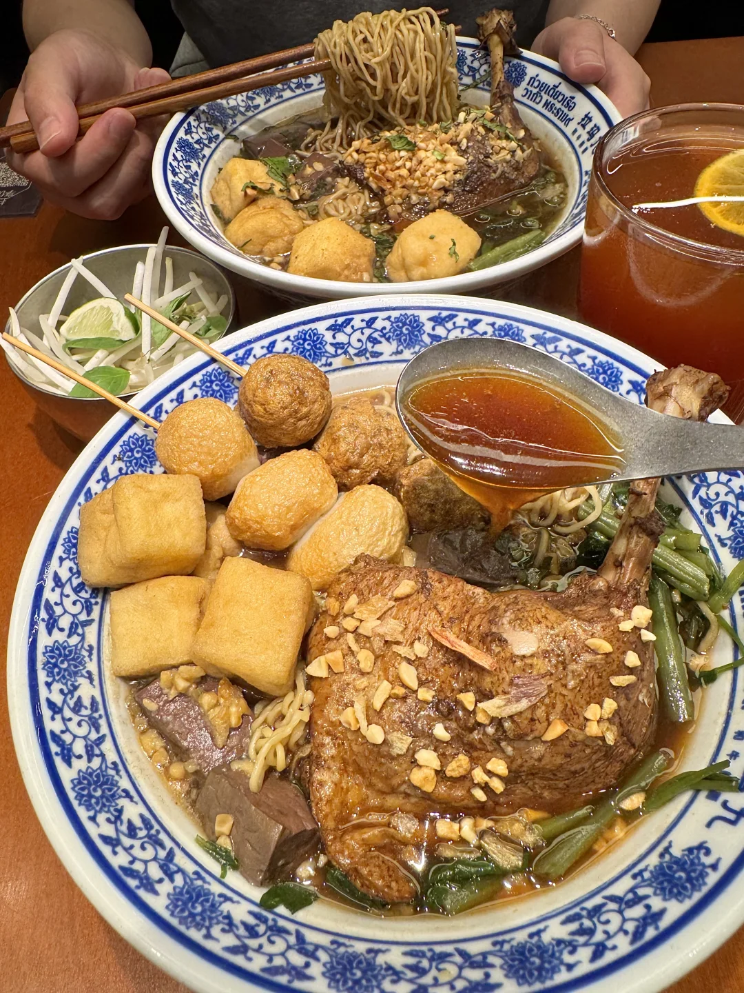 古法三宝船面!和牛+牛肉丸+牛筋!!满满一碗料好多~汤头鲜美一口下去好落胃!竹升面也好好嚼!朋友点的泰北鸭全宝面!超大只鸭腿排和鸭血鸭胸肉🤤!!一上桌香气就扑我一脸!来点青柠汁和辣椒醋很曼谷了!