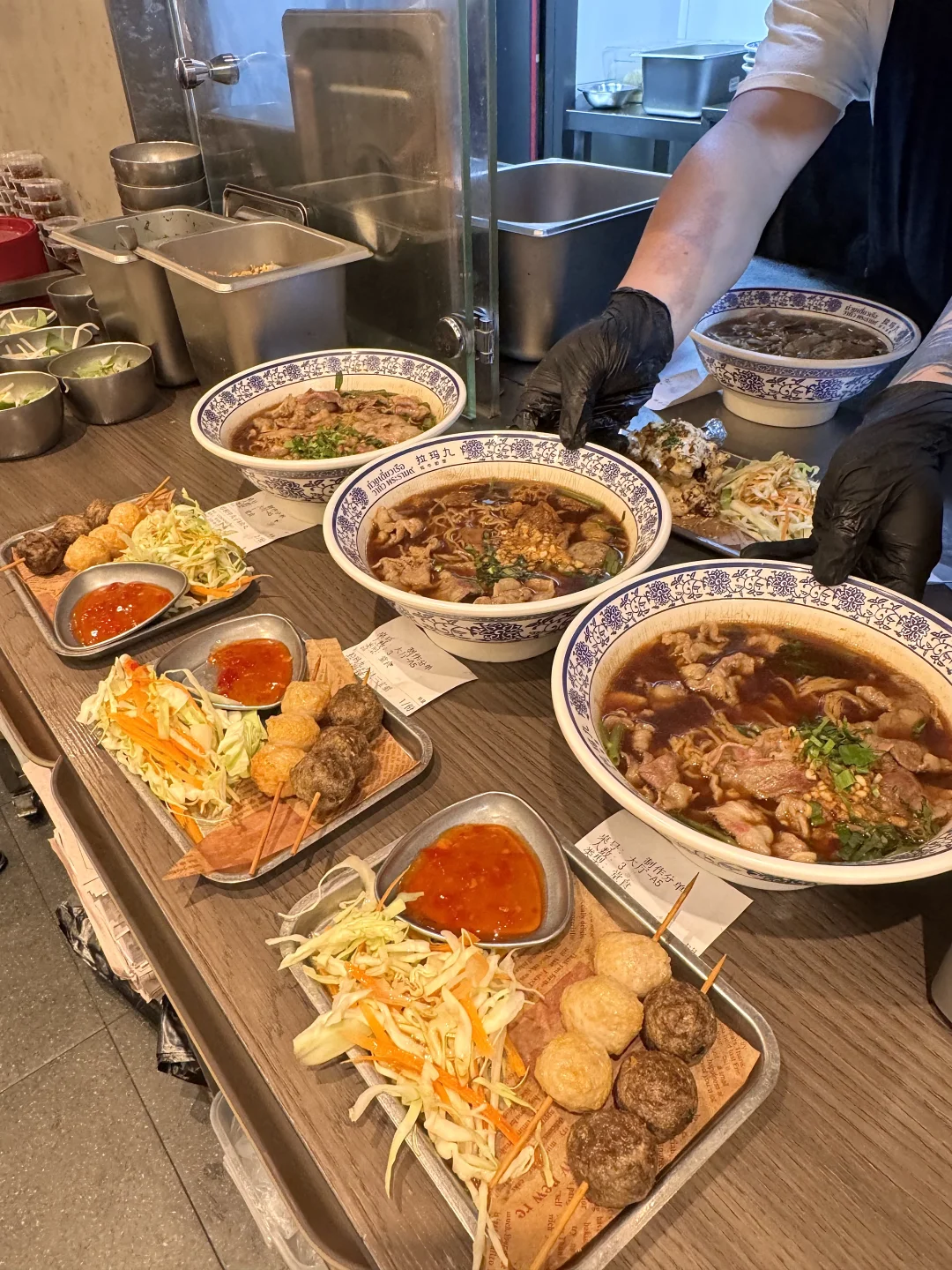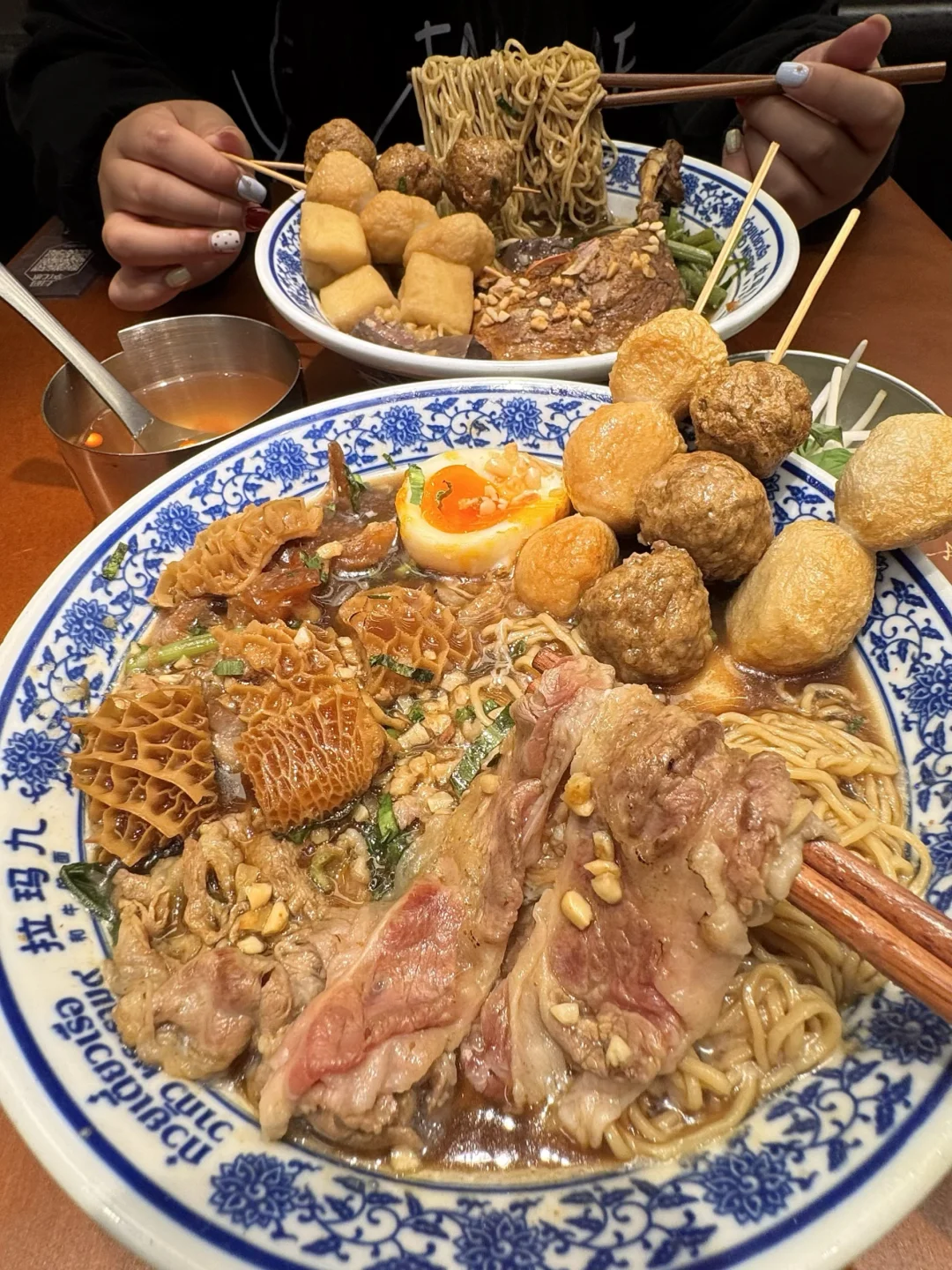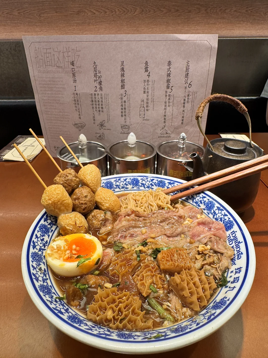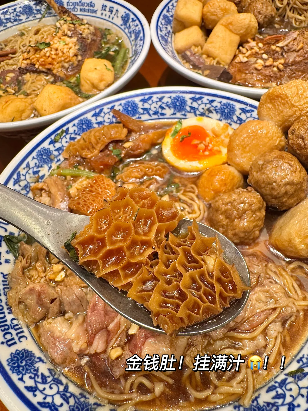 古法三宝船面!和牛+牛肉丸+牛筋!!满满一碗料好多~汤头鲜美一口下去好落胃!竹升面也好好嚼!朋友点的泰北鸭全宝面!超大只鸭腿排和鸭血鸭胸肉🤤!!一上桌香气就扑我一脸!来点青柠汁和辣椒醋很曼谷了!